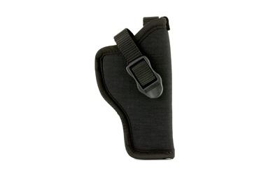 BLACKHAWK's classic, medium high ride design allows you to carry your favorite revolver or auto on any belt up to 2" wide. The BLACKHAWK Hip Holster is made of 1000 denier nylon, closed-cell foam padding and smooth nylon lining with a tough nylon web retention strap that has a combination adjustment buckle and sturdy snap for an easy draw. The holster features a nylon web sight channel and the extra strength injection molded belt loop accepts belts up to 2".