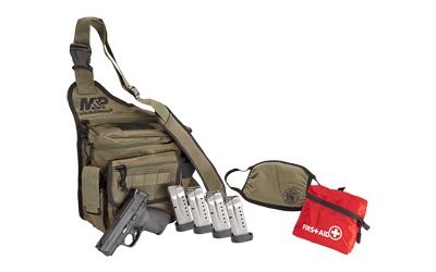 Smith & Wesson, M& P Shield 1.0 Bugout Bag Bundle, Semi-automatic, Striker Fired, Compact, 9MM, 3.1" Barrel, Polymer Frame, Armornite Black Finish, Thumb Safety, Includes M& P Branded OD Bug Out Bag, OD Face Mask, First Aid Kit, 5 Magazines, 1-7Rd & 4-8Rd