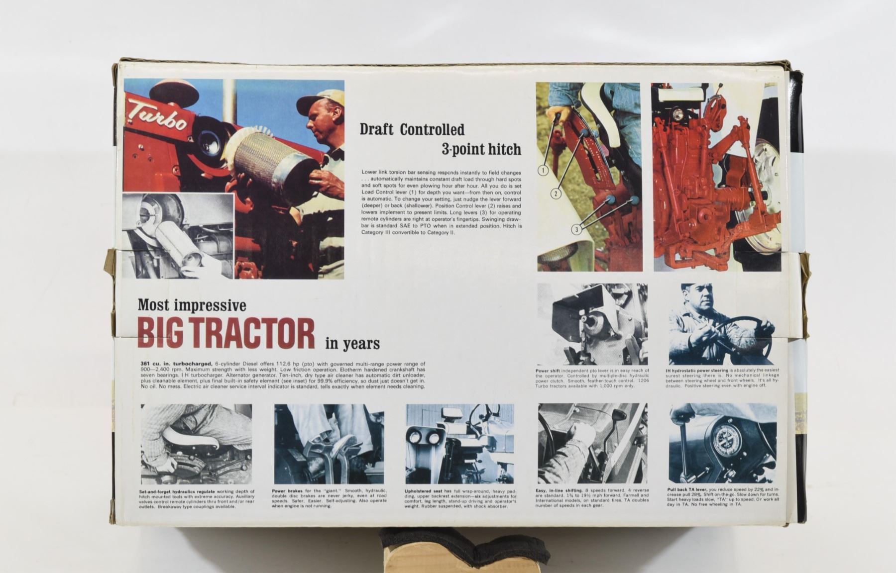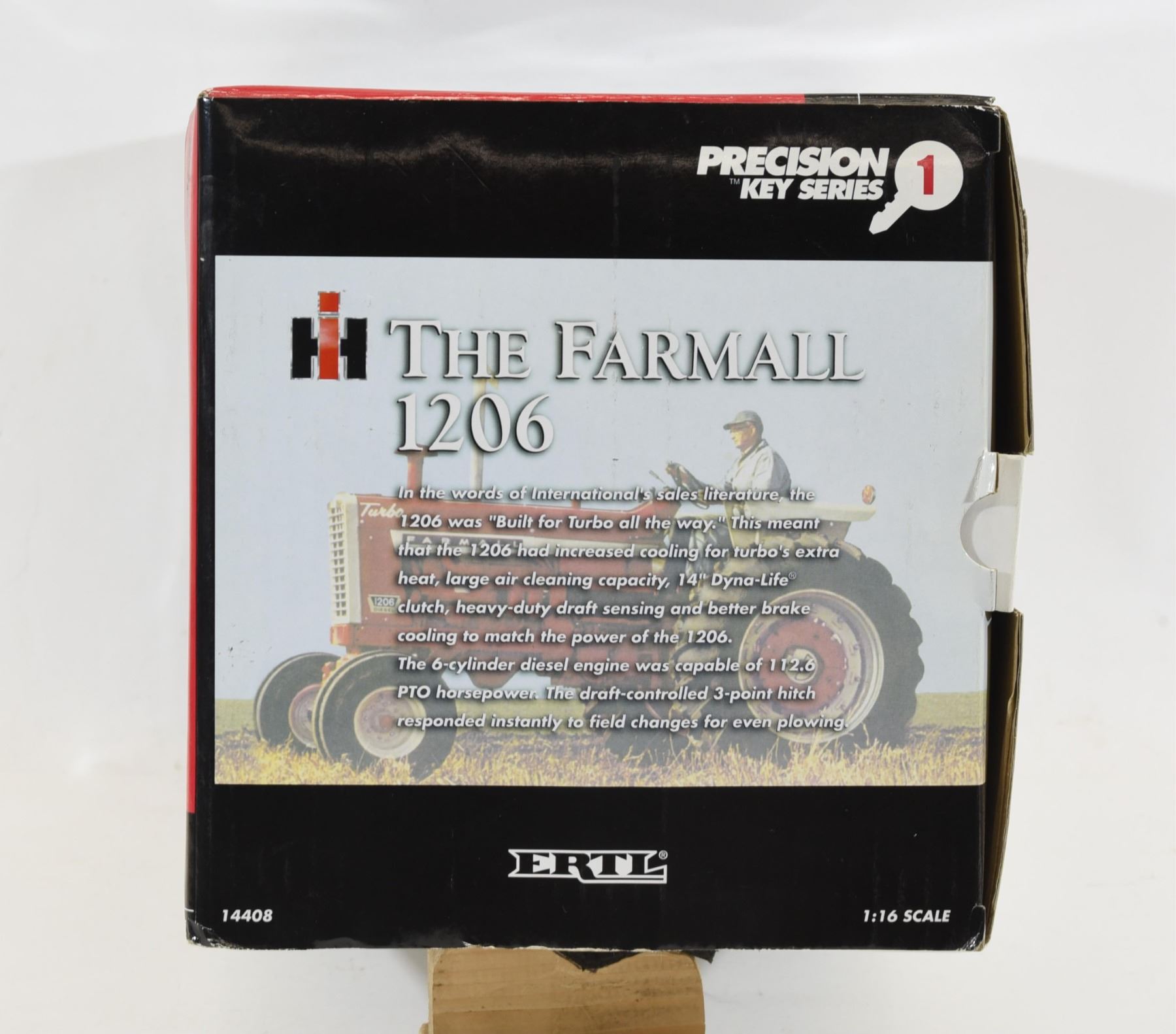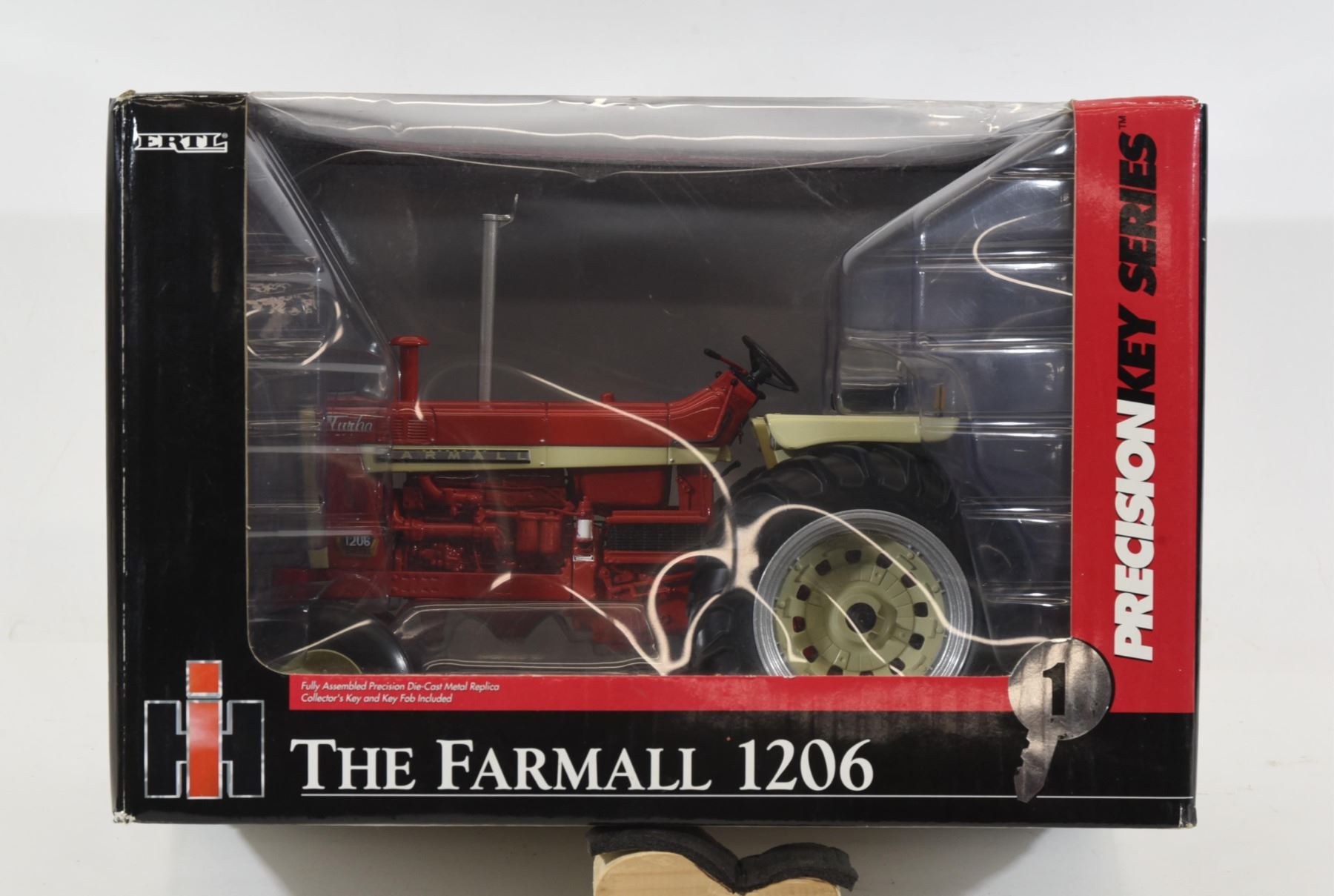 1/16th scale die-cast. Precision key series with collector key and key fob included. Tractor has removable front weights, moving gear shift levers and hydraulic controls, engine wiring and steerable wide front. As new in original package.