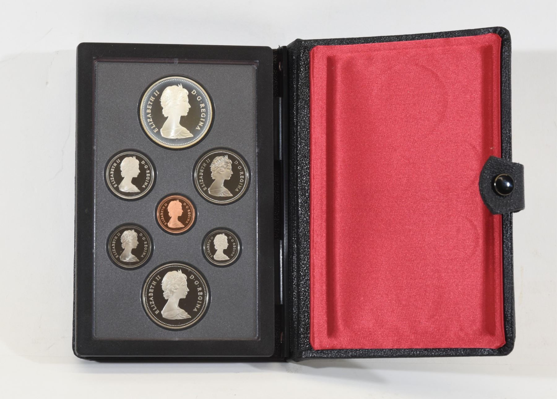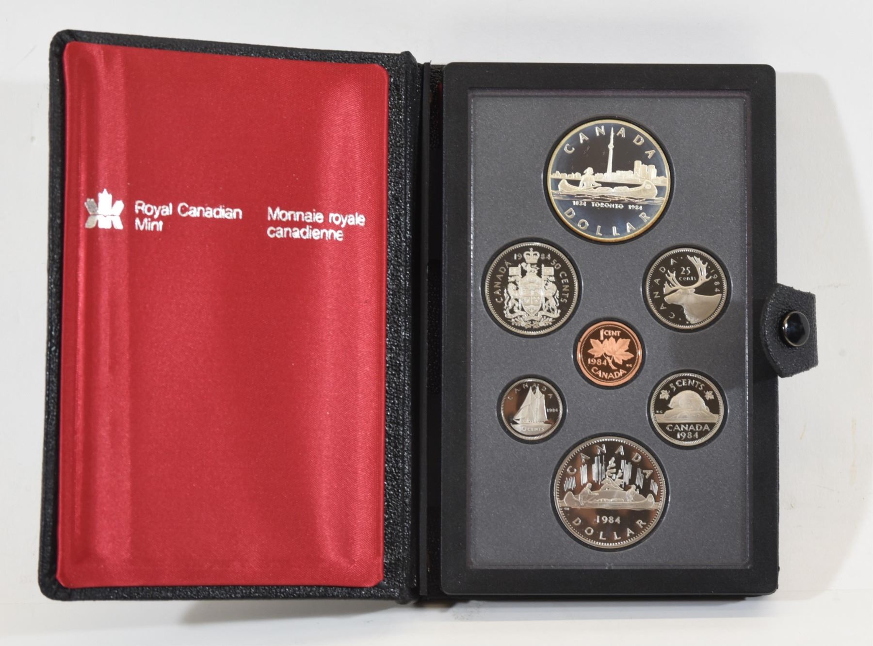 The silver dollar marks the 150th anniversary of Toronto. The reverse depicts an Indian in a canoe in the foreground and the skyline of Toronto in the background. The nickle dollar bears the popular design of the Indian and Voyageur in a canoe which appeard on the first Canadian silver dollar issued in 1935.