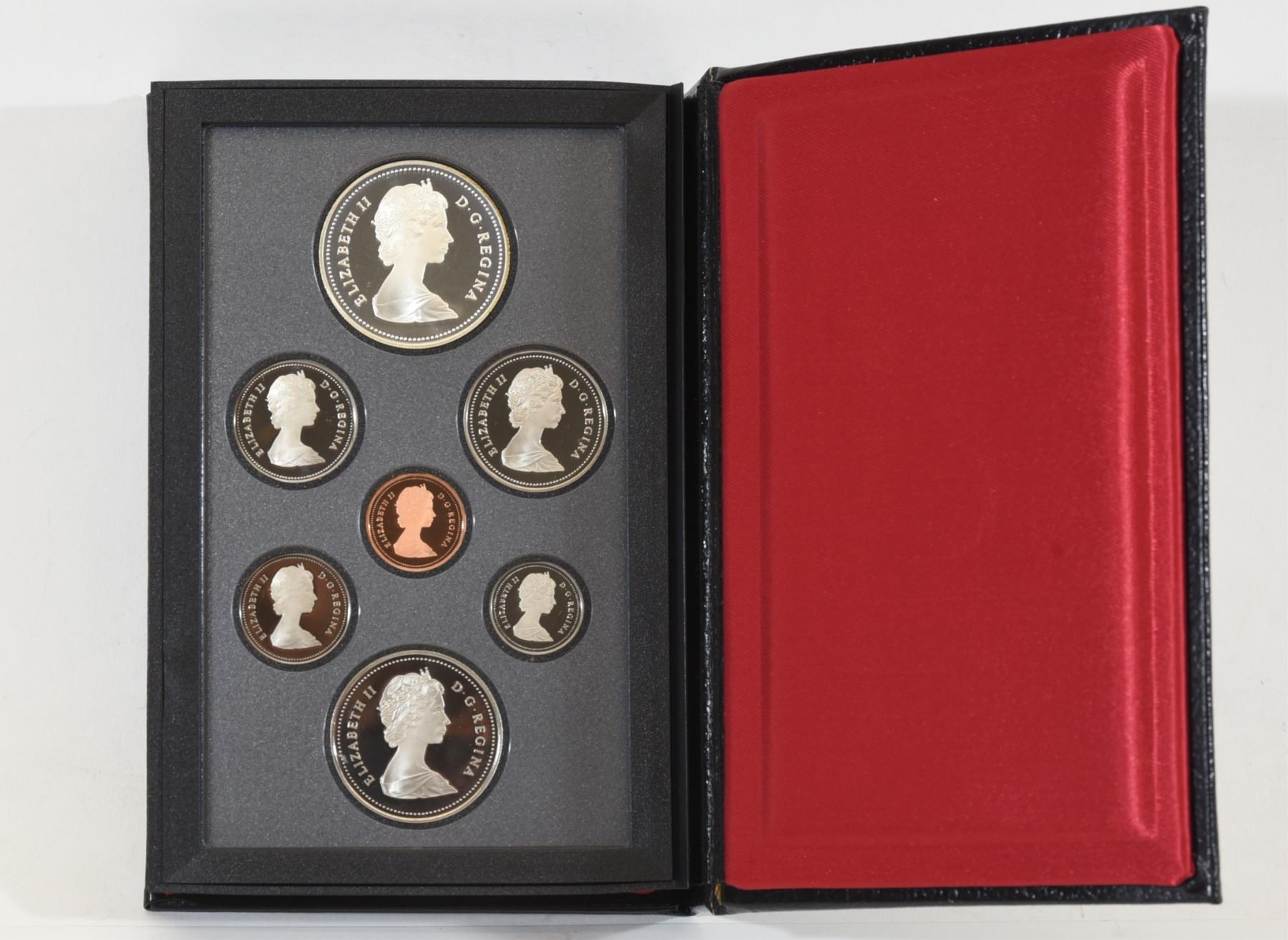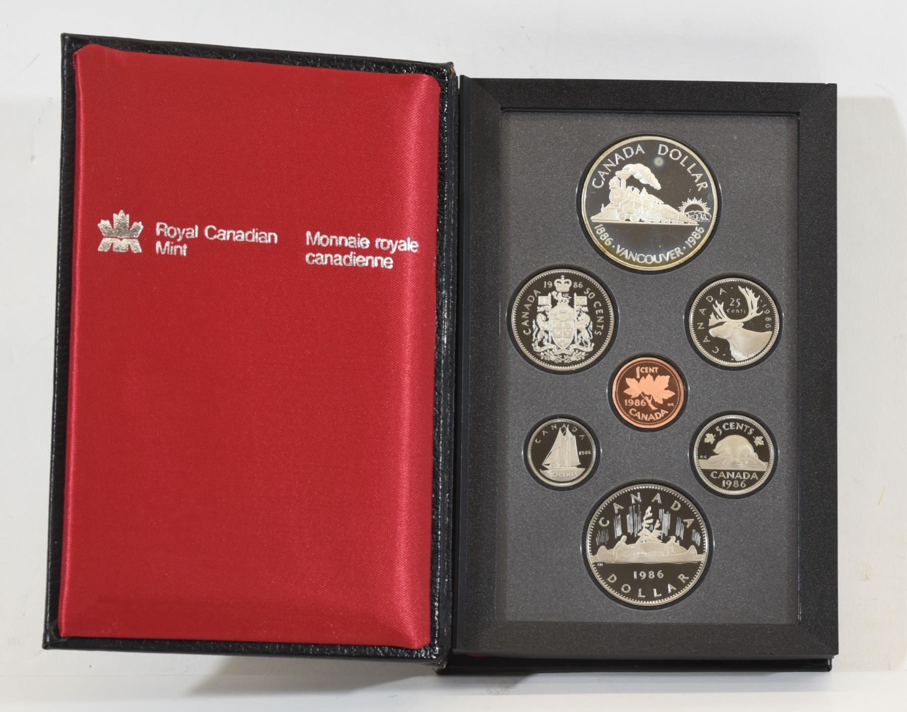 The silver dollar marks the 100th anniversary of the inauguration of the Transcontinental railroad and the centenary of the cith of Vancouver. The reverse depicts engine no. 371 and the first transcontinental passenger train with the city of Vancouver in the background. The nickle dollar bears the popular design of the Indian and Voyageur in a canoe which appeard on the first Canadian silver dollar issued in 1935.