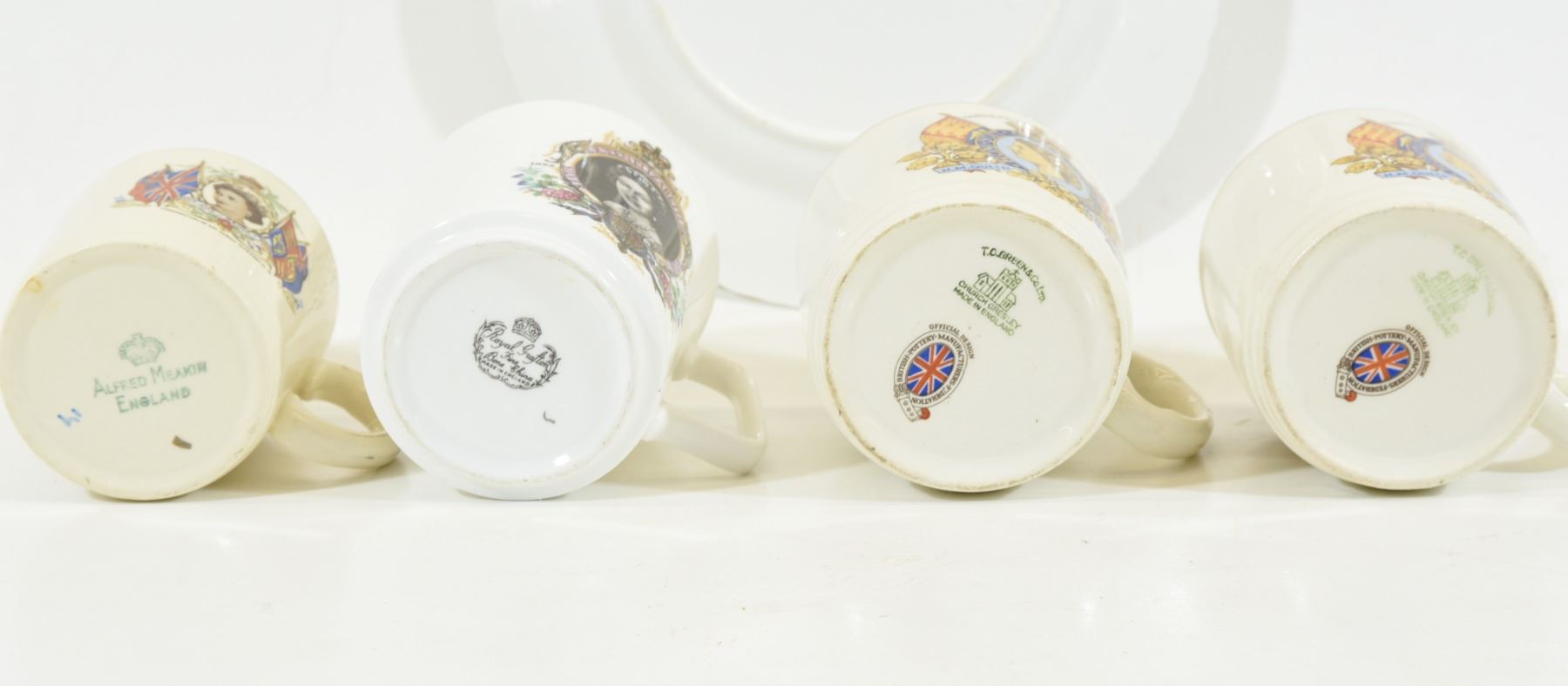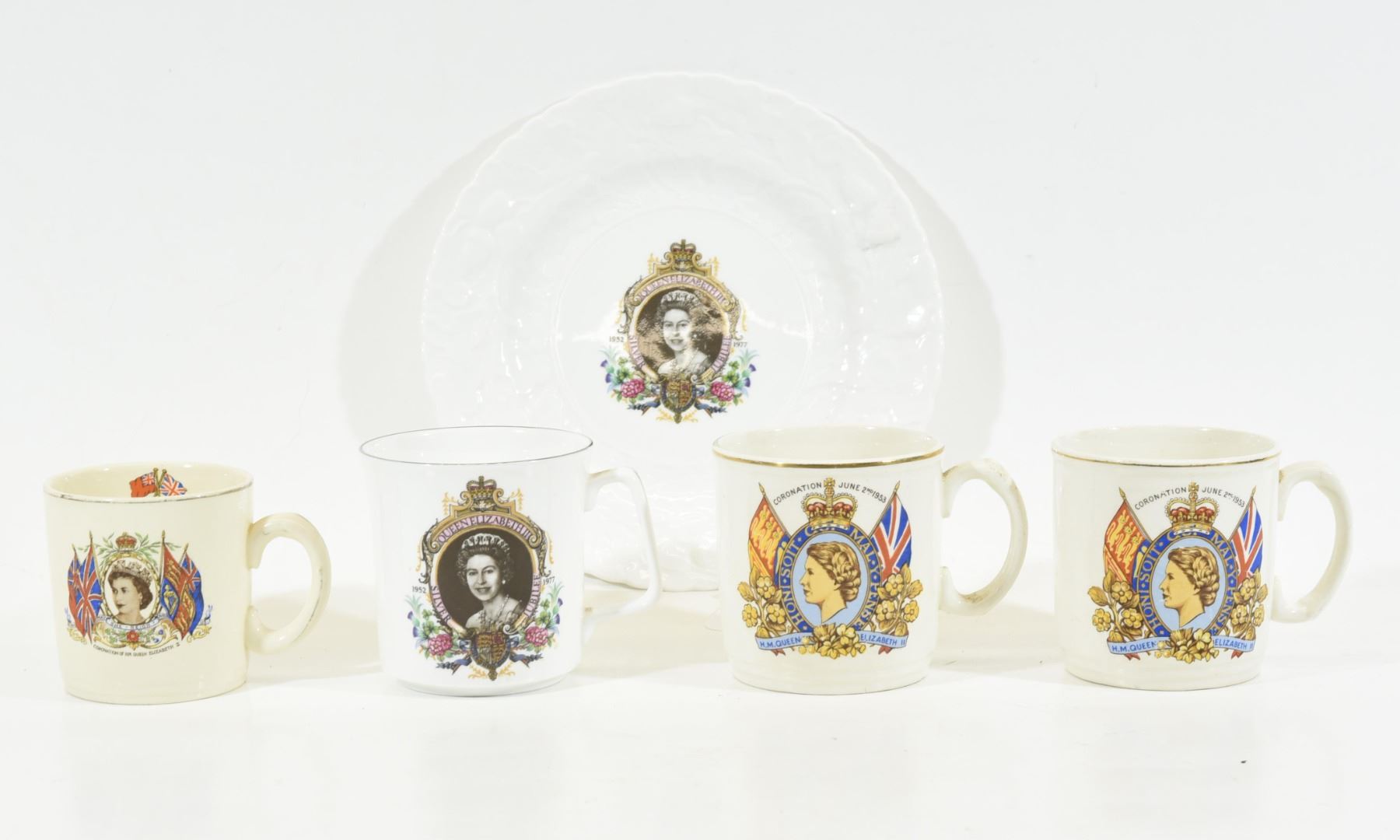 Queen Elizabeth Silver Jubilee plate and one cup. Three coronation cups.