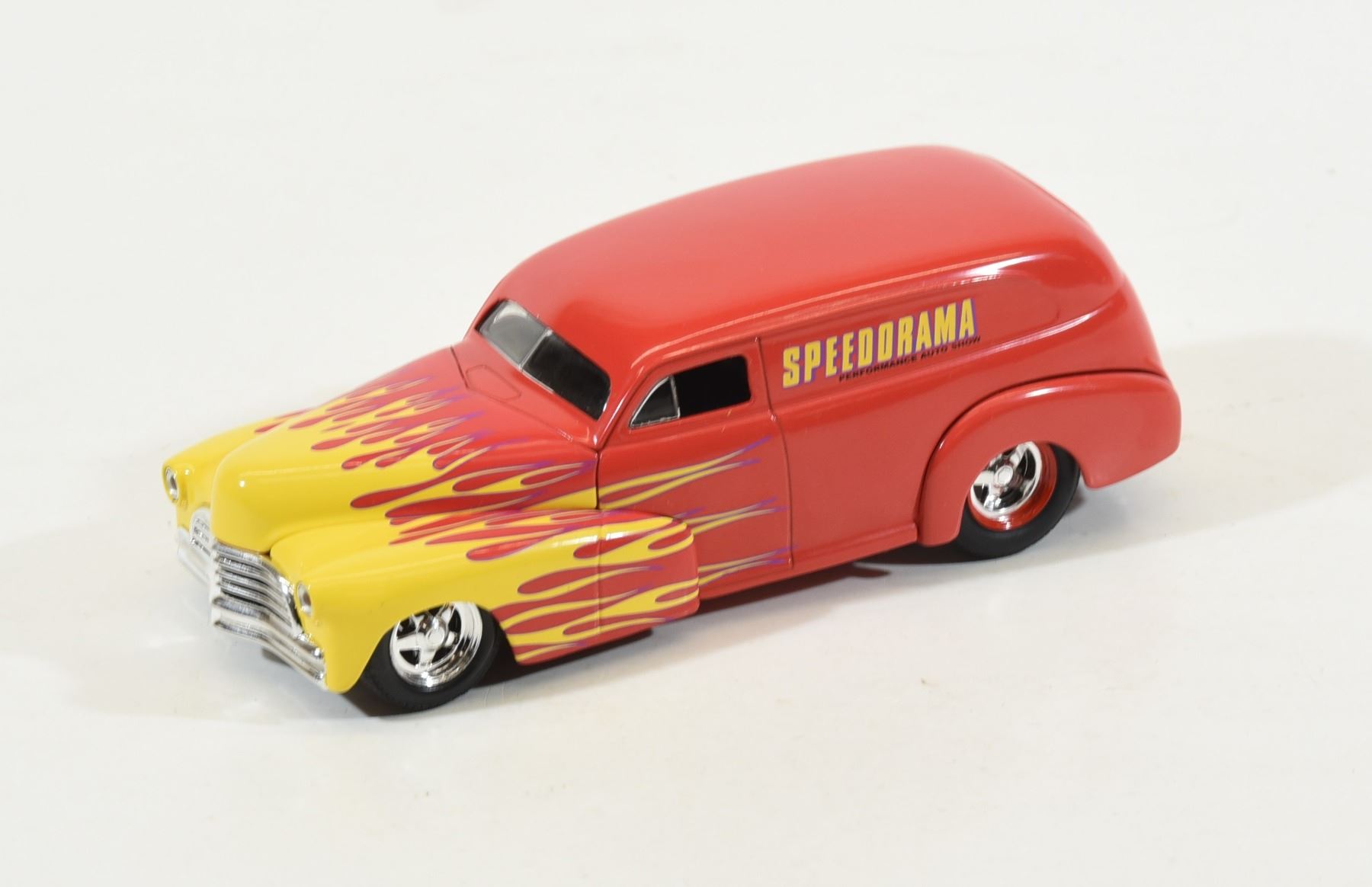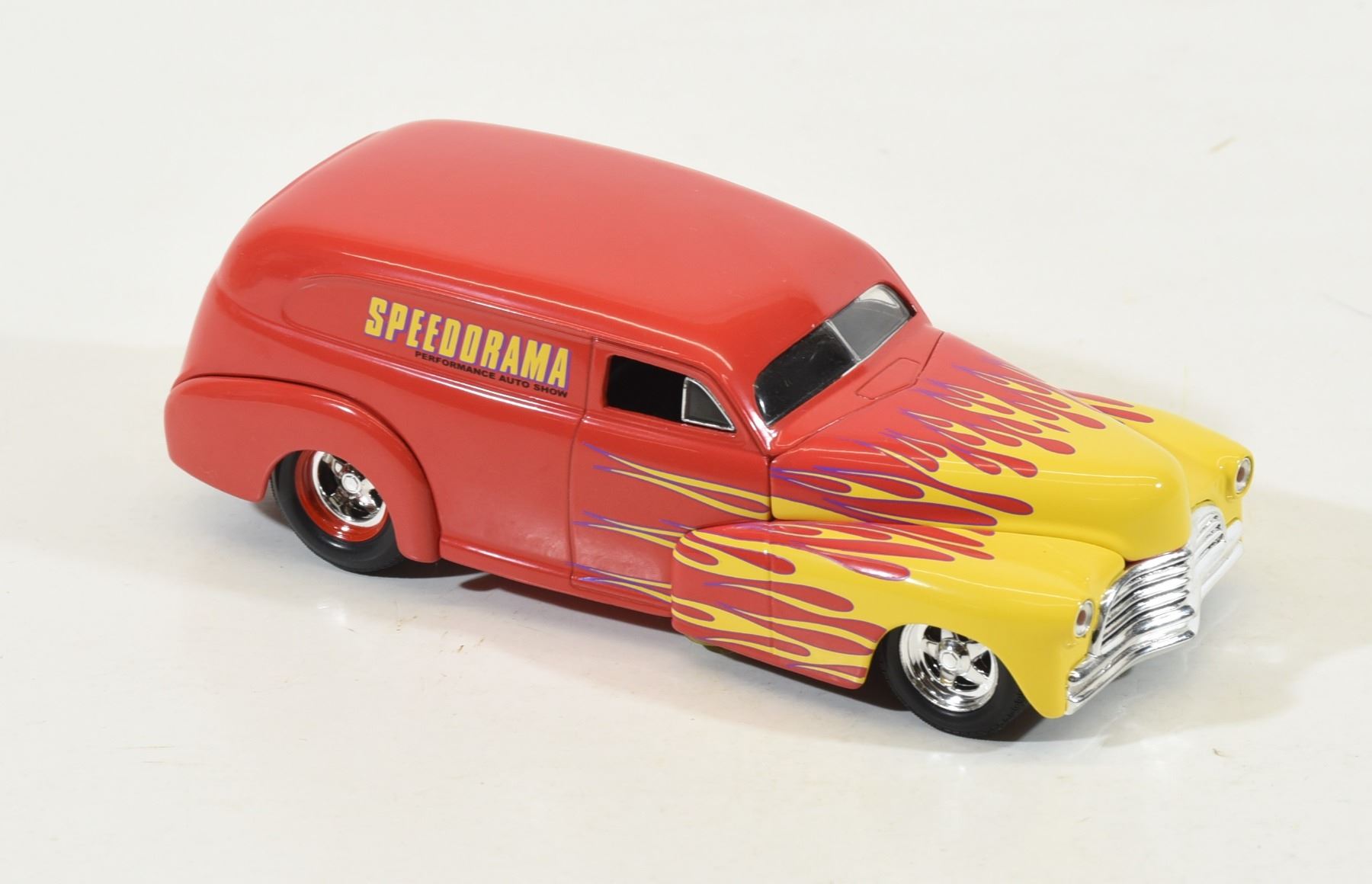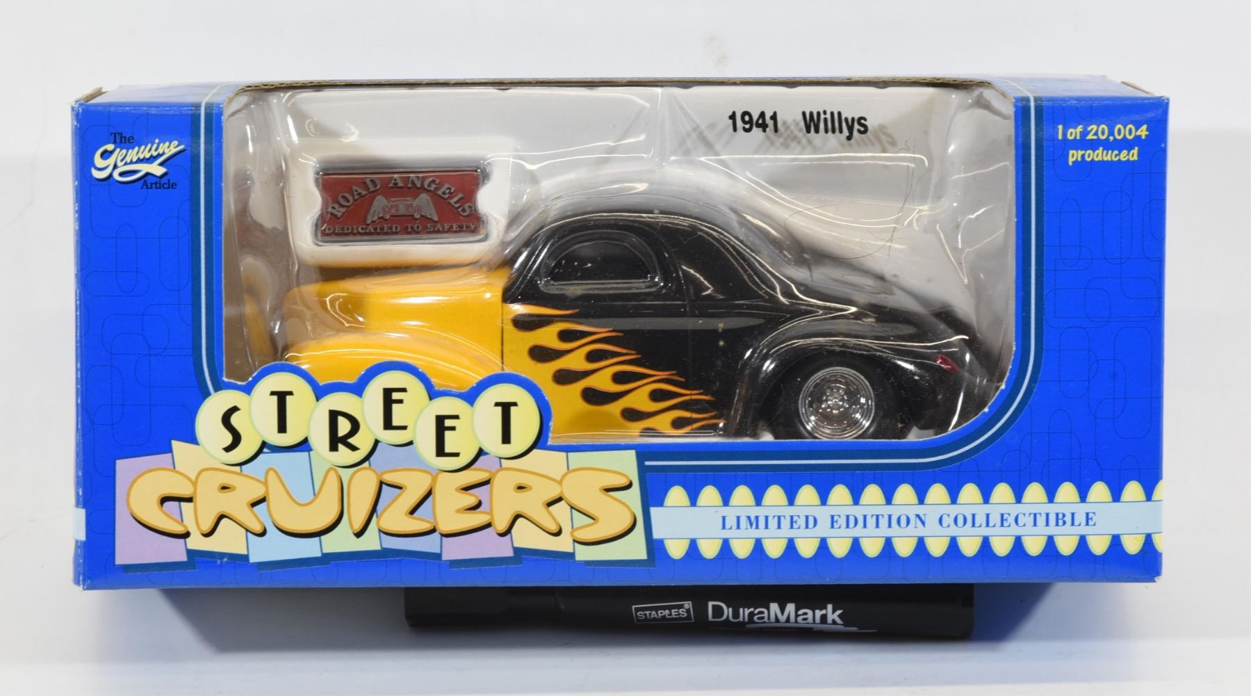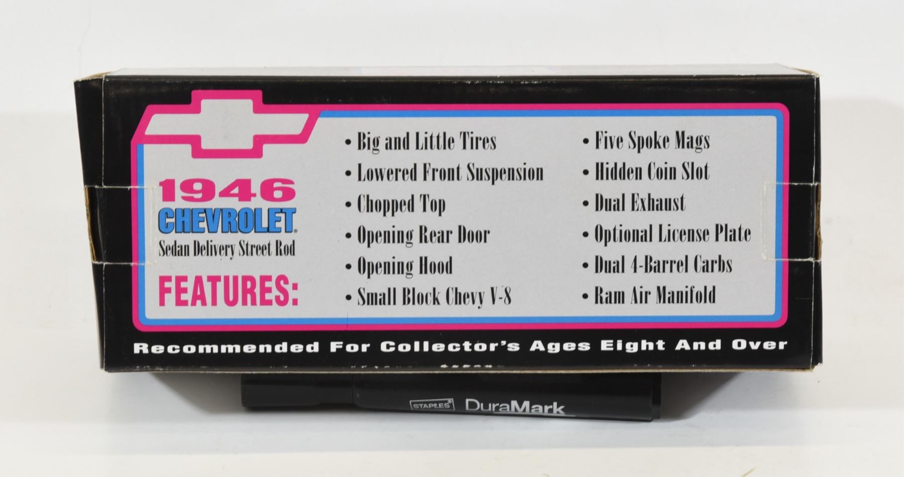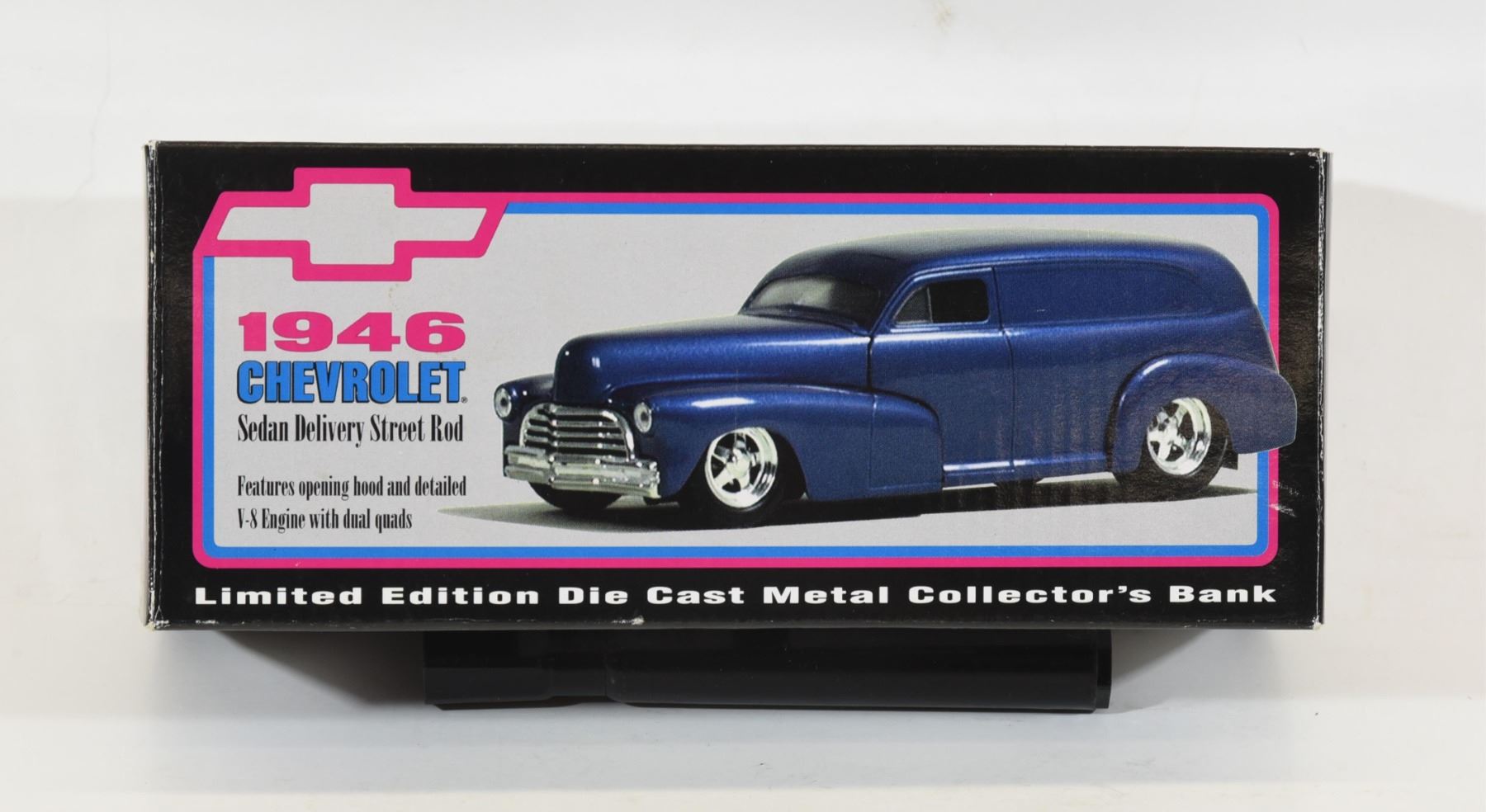 SpecCast 1:25 scale 1946 Chevy Sedan Delivery street rod bank. Street Cruisers 1941 Willys Road Angels street rod. Scale undetermined. Both in boxes.
