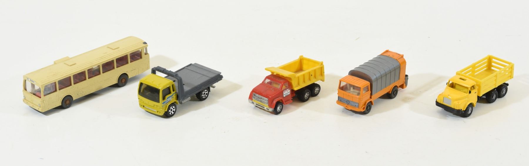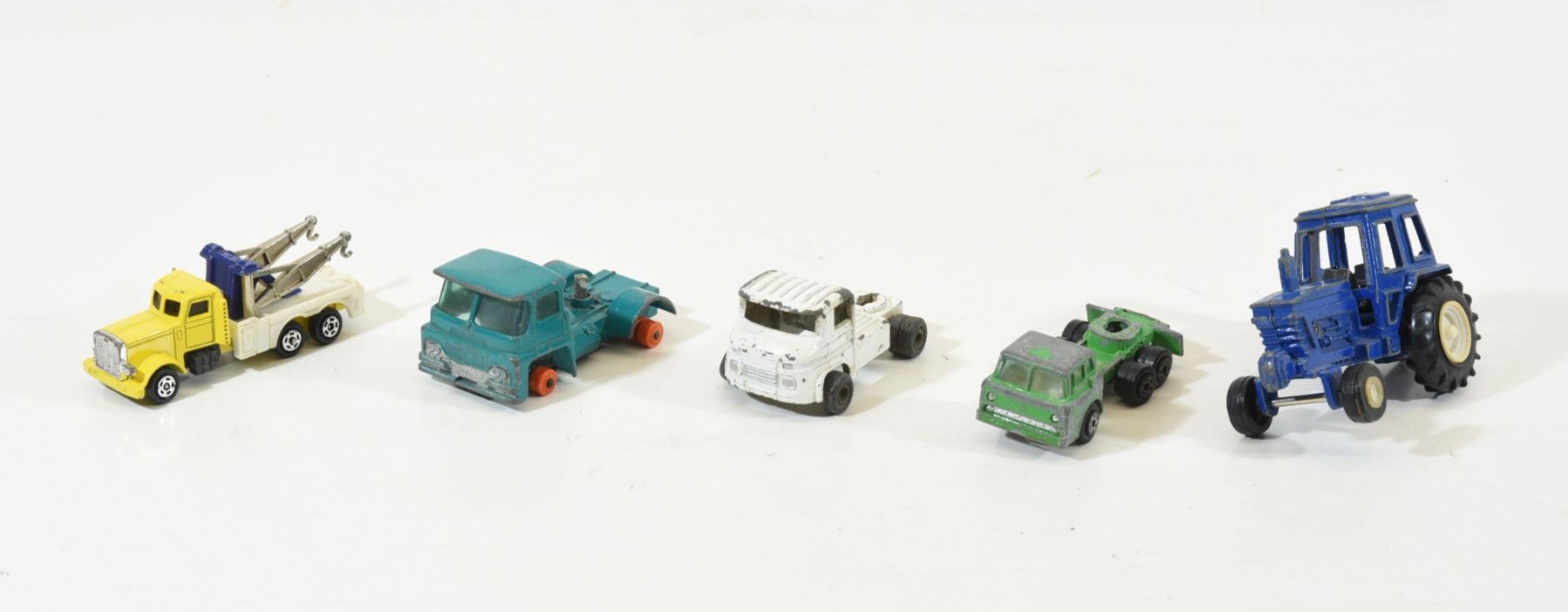 10 pieces of small trucks, bus and tractor in varying states of repair. Parts missing and broken pieces.