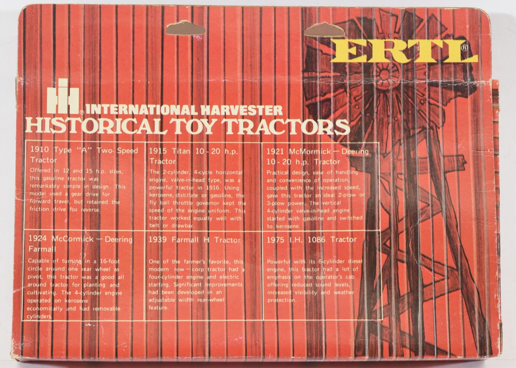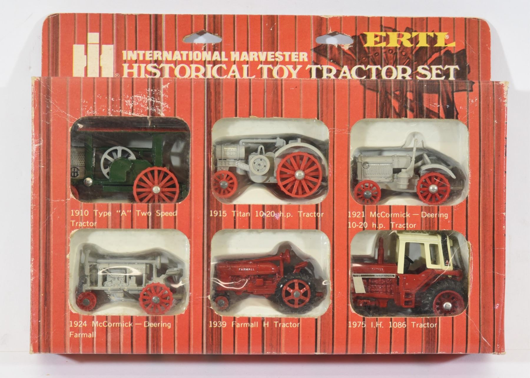 Ertl 6-piece International Harvester tractor set in box containing: 1910 Type 'A', 1915 Titan, 1921 McCormick-Deering, 1924 McCormick-Deering, 1939 Farmall H, 1975 International Harvester 1086.