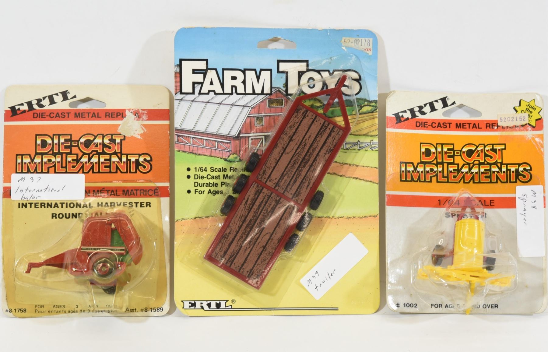 1:64 scale sprayer. 1:64 scale International Harvester round baler. 1:64 scale 3 axle trailer.