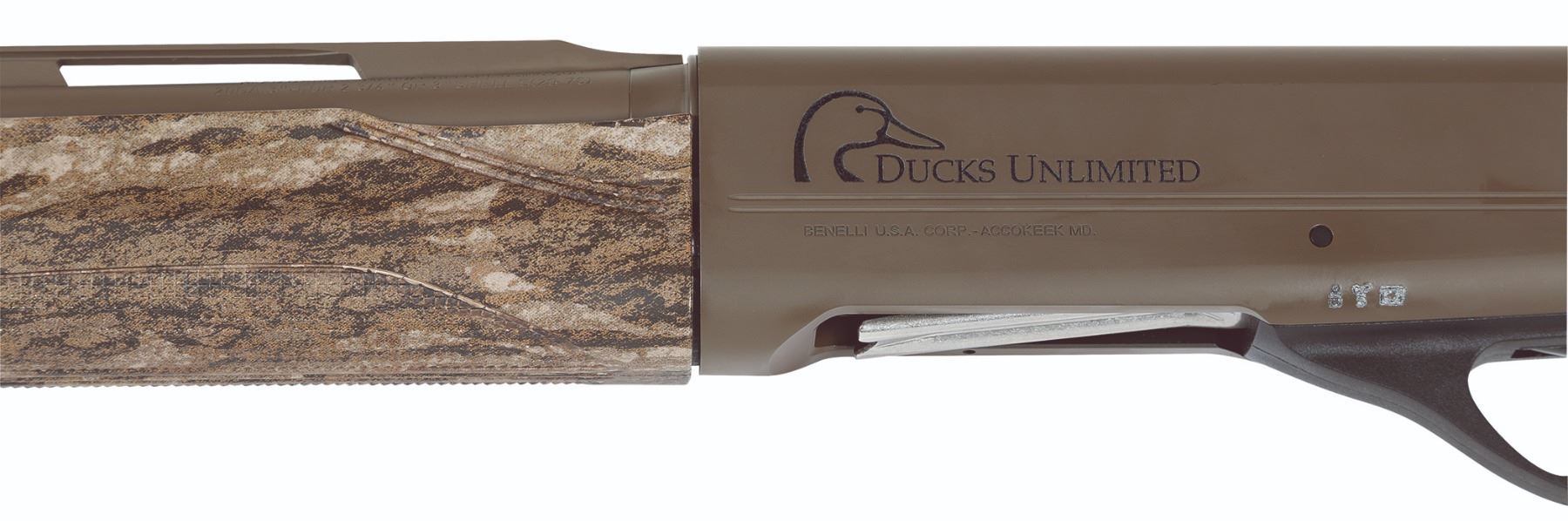 20 gauge semi-automatic shotgun, 3” chamber. 28” barrel. Ducks Unlimited exclusive camo and color combination with DU Mossy Oak Bottomland camo on the stock and forend and Patriot Brown Cerakote on the barrel and receiver. Three extended interchangeable choke tubes. Ducks Unlimited logo on the receiver. Gun lock included.