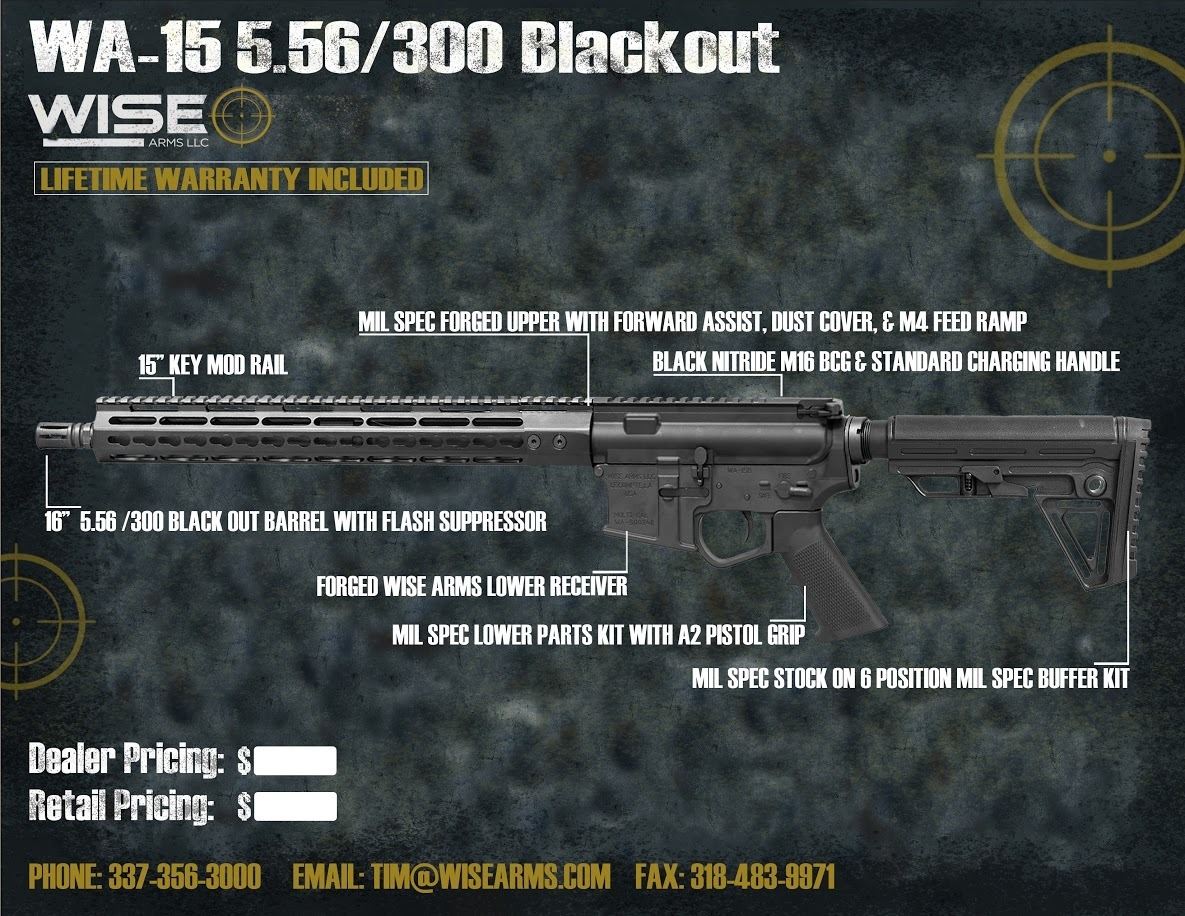 WISE ARMS LLC 16 INCH 300 Blackout COMPLETE RIFLE. BILLET LOWER RECEIVER W/ OVERSIZED TRIGGER GUARD MACHINED IN. MIL SPEC LOWER PARTS KIT. MIL SPEC 6 POSITION BUFFER KIT AND STOCK. FORGED UPPER RECEIVER WITH FORWARD ASSIST AND DUST COVER. BLACK NITRIDE M16 BCG WITH STANDARD CHARGING HANDLE. 16 INCH 5.56 NATO M4 PROFILE BARREL WITH STANDARD FLASH HIDER. 15 INCH KEYMOD HAND GUARD. COMES WITH ONE 30 ROUND MAGAZINE. ALL WISE ARMS LLC FIREARMS COMES WITH A LIFETIME WARRANTY.