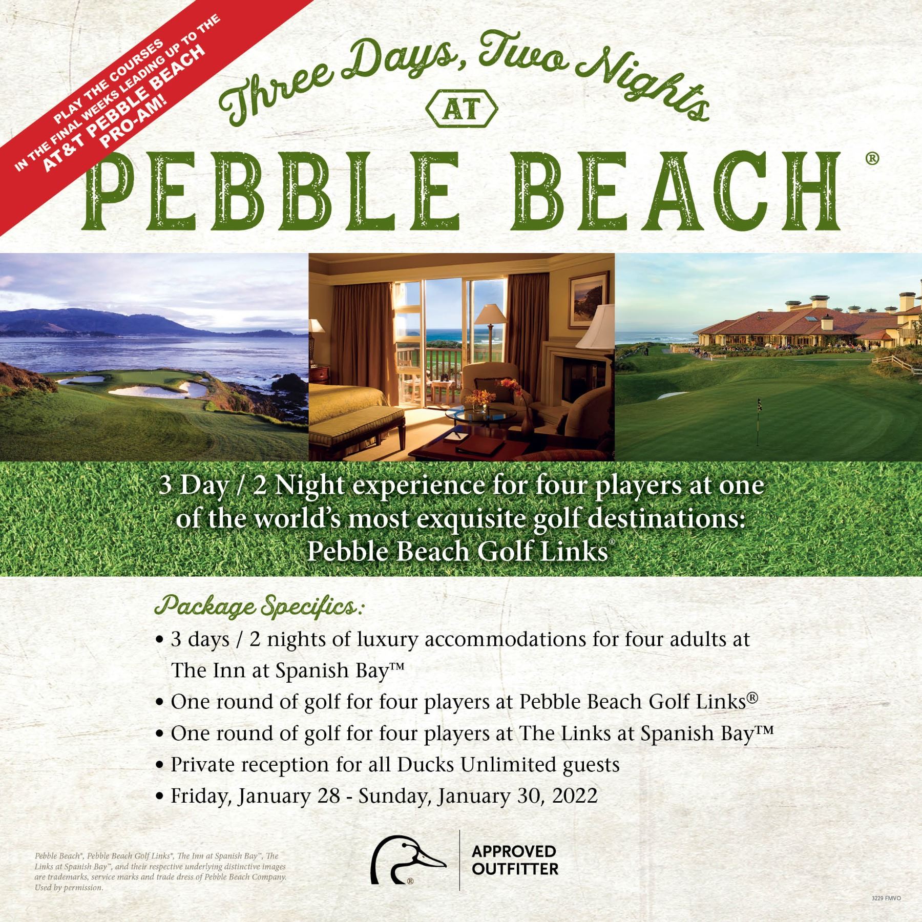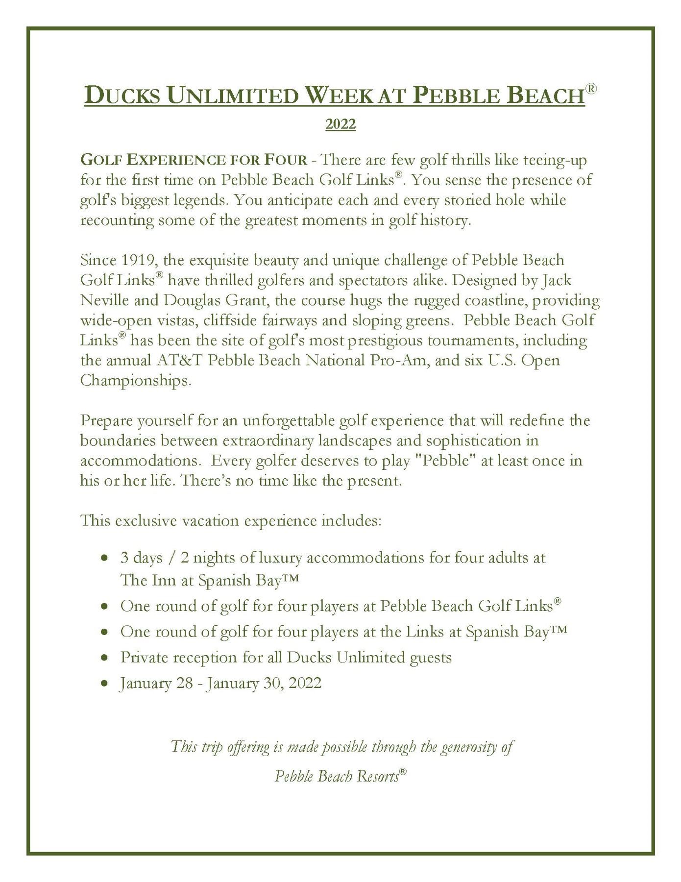There are few golf thrills like teeing-up for the first time on Pebble Beach Golf Links®. You sense the presence of golf's biggest legends. You anticipate each and every storied hole while recounting some of the greatest moments in golf history. Since 1919, the exquisite beauty and unique challenge of Pebble Beach Golf Links® have thrilled golfers and spectators alike. Designed by Jack Neville and Douglas Grant, the course hugs the rugged coastline, providing wide-open vistas, cliffside fairways and sloping greens. Pebble Beach Golf Links® has been the site of golf's most prestigious tournaments, including the annual AT&T Pebble Beach National Pro-Am, and six U.S. Open Championships. Prepare yourself for an unforgettable golf experience that will redefine the boundaries between extraordinary landscapes and sophistication in accommodations. Every golfer deserves to play "Pebble" at least once in his or her life. There’s no time like the present. This exclusive vacation experience includes: 3 days / 2 nights of luxury accommodations for four adults at The Inn at Spanish Bay™. One round of golf for four players at Pebble Beach Golf Links®. One round of golf for four players at the Links at Spanish Bay™. Private reception for all Ducks Unlimited guests. January 28 - January 30, 2022.