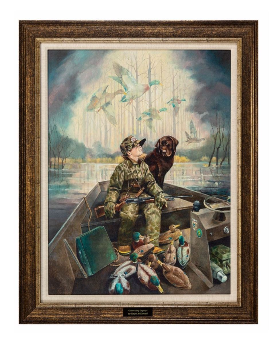 Image Size: 29”x22” In 1993, Greenwing Legacy was published by Ducks Unlimited as a lithograph print. This first youth image by Ralph McDonald paved the way for a successful series of Greenwing images for DU events. We are excited to offer chapters this cherished image as a framed canvas with brass title plate.