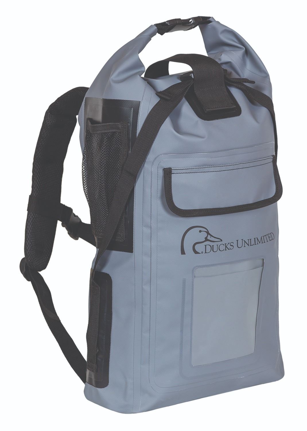 This gray and black DU backpack features durable waterproof PVC coating to resist dirt and water. It includes a roll-top closure with quick-release buckles, a large inner compartment with fold over flap, small front pocket with a clear window, side mesh pockets, and adjustable padded shoulder straps.