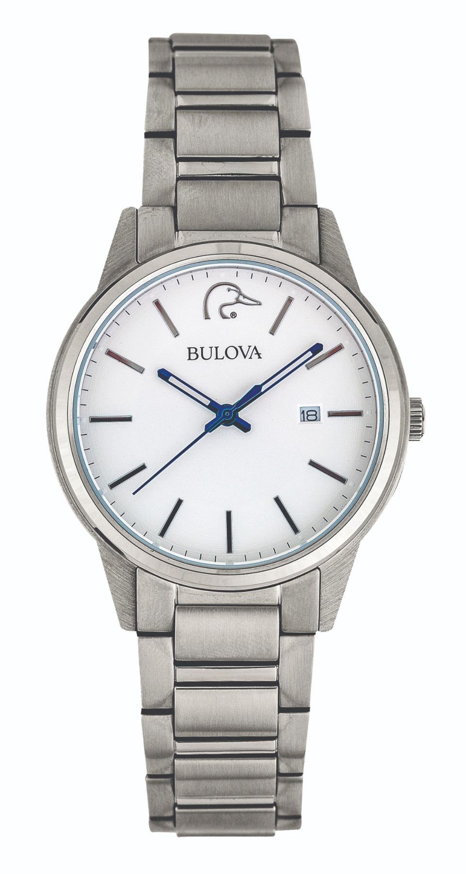 This men’s polished stainless steel watch features the Ducks Unlimited and Bulova logos on the dial. The timepiece is water resistant to 30 meters and includes a white round dial, hour and minute markers, royal blue hands, a date feature, and a fold over buckle clasp. It comes packaged in a black presentation box featuring the Ducks Unlimited and Bulova logos.