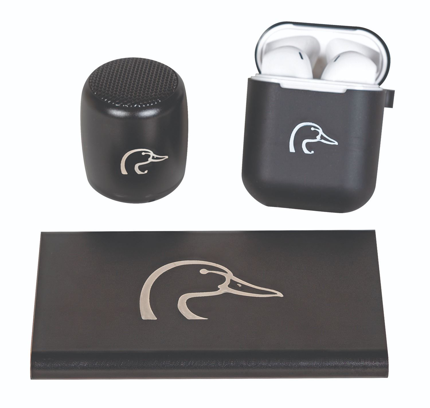 This portable tech set includes stereo sound pairing earbuds, a mini barrel Bluetooth speaker and a 4000mAh power bank. Each piece features the DU logo and its own USB charging cable. The earbuds come in a charging case with a silicone outer cover.