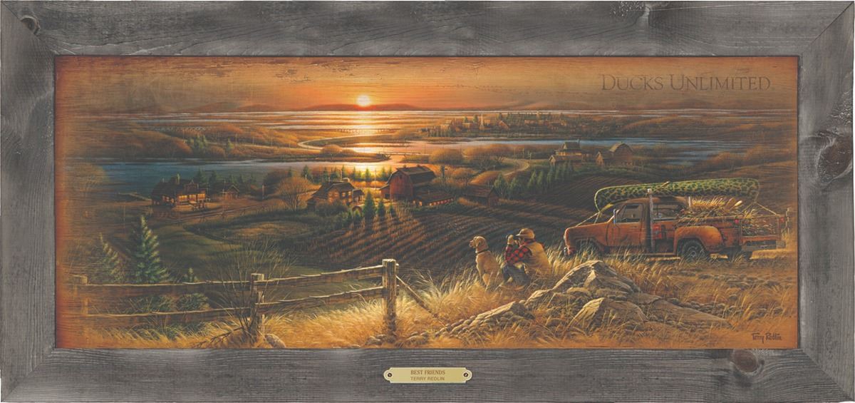 Best Friends by Terry Redlin portrays a man and his dog watching the distant waterfowl as the sun sets over rural America. The painting is customized to Ducks Unlimited and features a DU crest decal on the rear window of the pickup truck. The image is printed on wood and includes a rustic barnwood frame and brass title plate. Ducks Unlimited has raised over $34 million dollars from the sale of Terry Redlin artwork. Overall dimensions are 16”x34”.