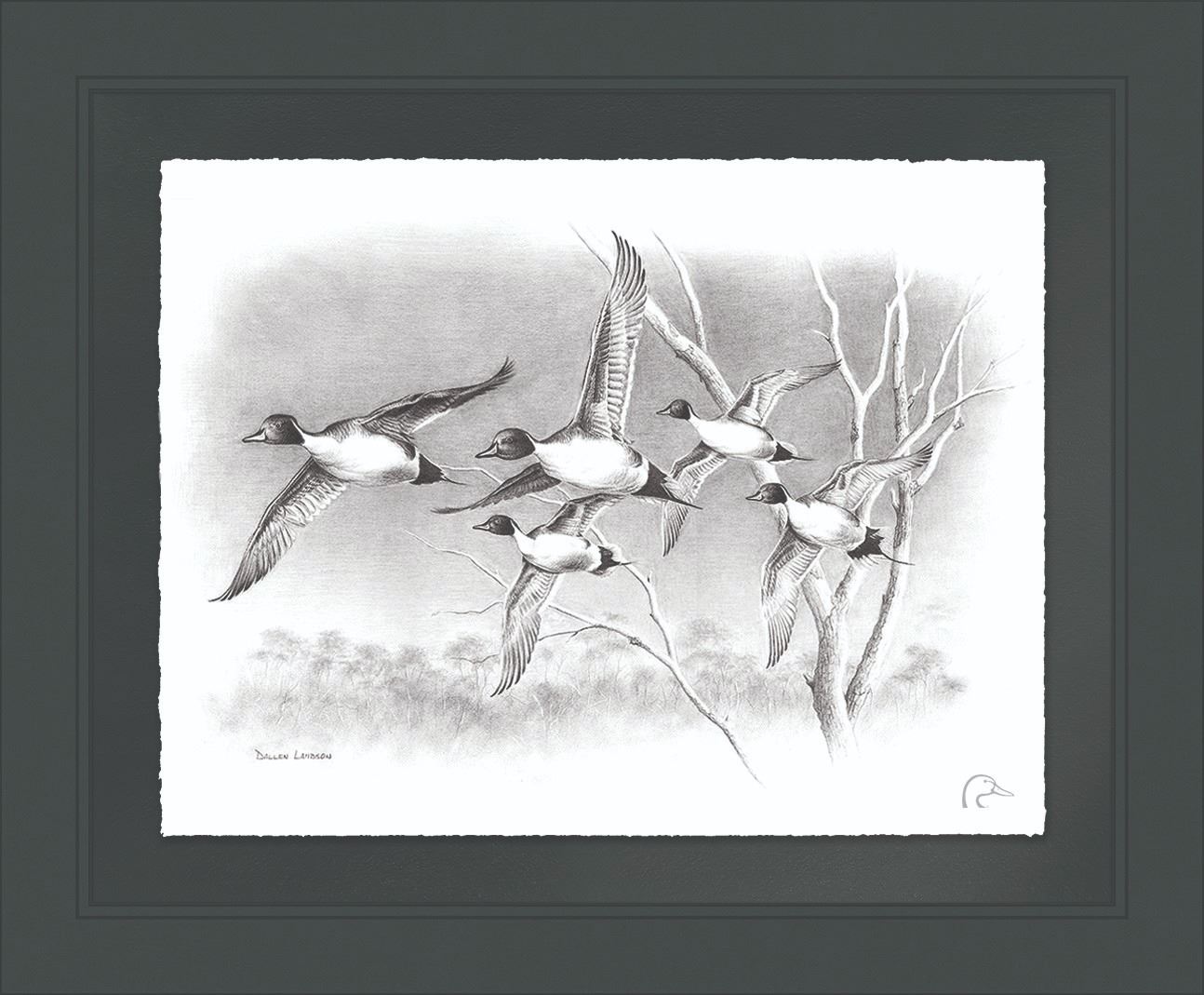 This flying pintail illustration is by wildlife artist Dallen Lambson. The print features hand-deckled edges and the DU logo. It is handsomely presented in a shadow box frame with a textured mat. Proudly made in the USA. Overall dimensions are 19”x23”x1¾”.