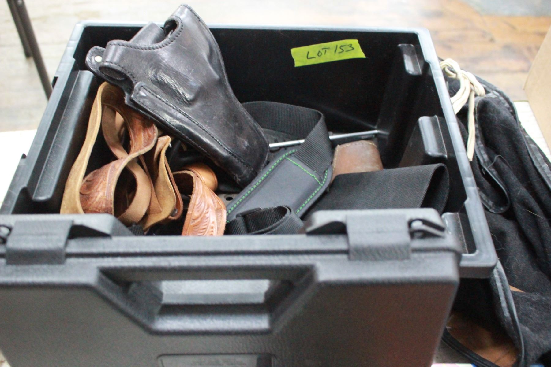 Lot 153 Tote of Misc.; Holsters, Slings, Gun Stock, Ammo Carriers, & Butt Pads