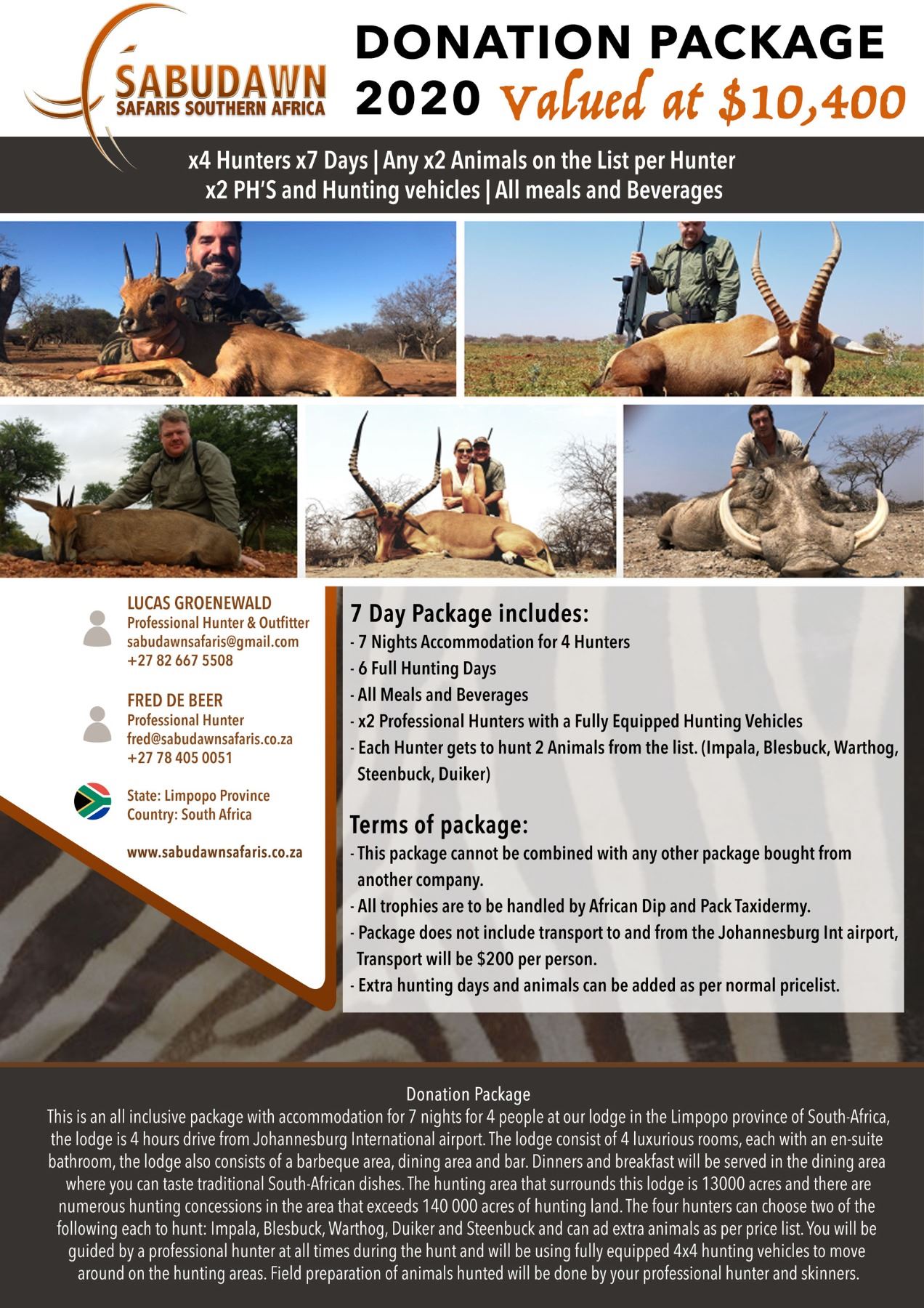 This is an all inclusive package with accommodation for 7 nights for 4 people at our lodge in the Limpopo province of South Africa, the lodge is 4 hours drive from Johannesburg airport. The lodge consists of 4 luxurious rooms, each with an en-suite bathroom, the lodge also consists of a barbeque area, dining area and bar. Dinners and breakfast will be served in the dining area where you can taste traditional South-Africa dishes. The hunting area that surrounds this lodge is 13000 acres and there are numerous hunting concessions in the area that exceeds 140,000 acres of hunting land. The four hunters can choose two of the following each to hunt; Impala, Blesbuck, Warthog, Duiker and Steenbuck and cad add extra animals as per the price list. You will be guided by a professional hunter at all times during the hunt and will be using fully equipped 4x4 hunting vehicles to move around on the hunting areas. Field preparation of animals hunted will be done by our professional hunter and skinners.