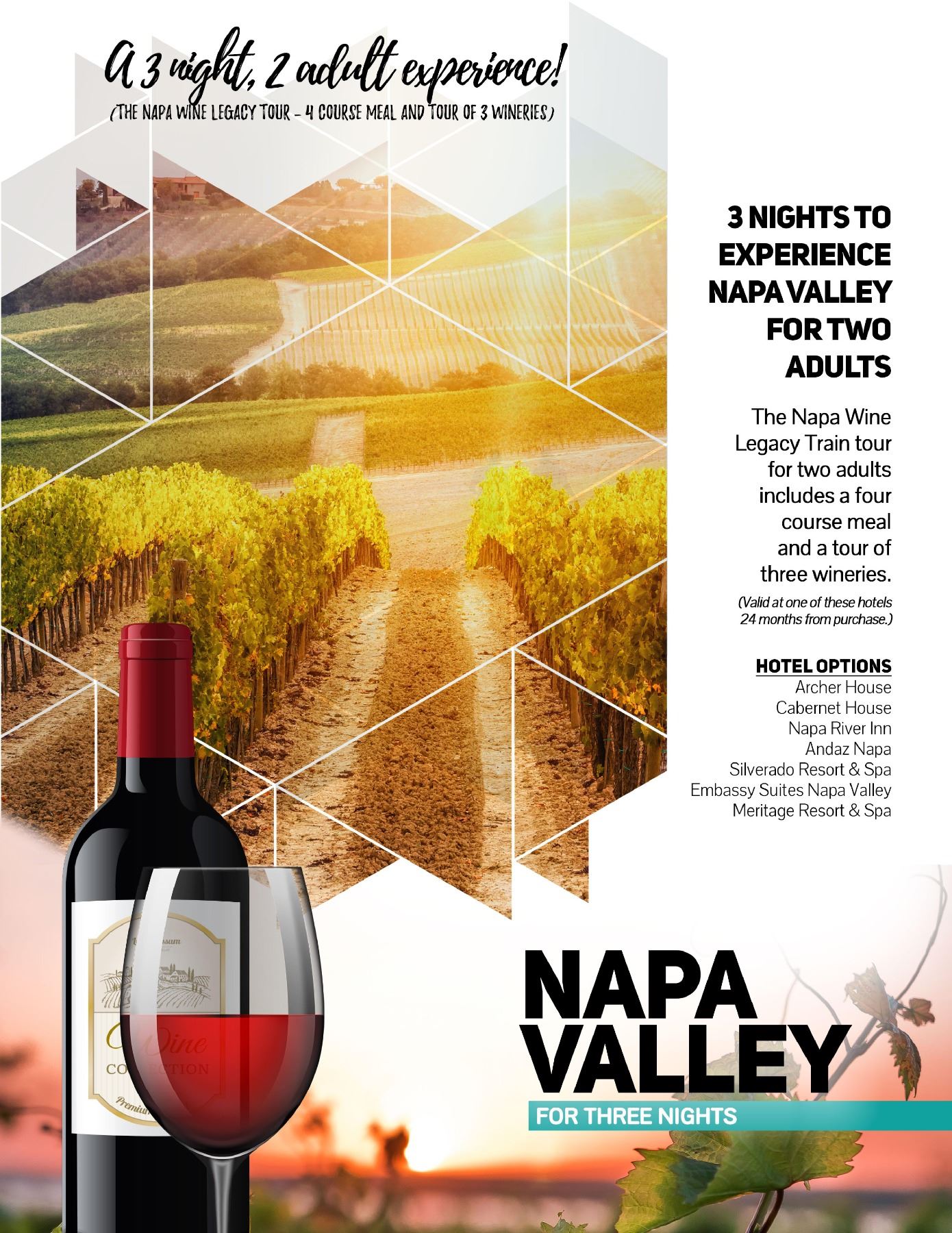 3 Night Napa Valley Experience for 2 adults. This package offers the opportunity to experience Napa Valley for two adults for three nights. It is the Napa Wine Legacy Train Tour and includes a four course meal and tour of three wineries, as well as choice of various hotels to stay at – Archer House, Cabernet House, Napa River Inn, Andaz Napa, Silverado resort and Spa, Embassy Suites Napa Valley, or Meritage Resort & Spa. A truly Unique trip and experience.