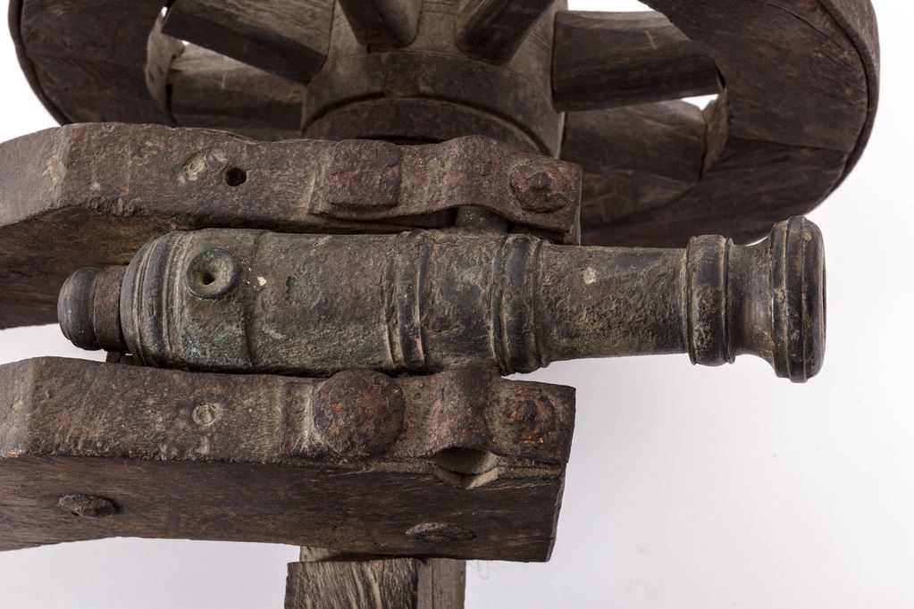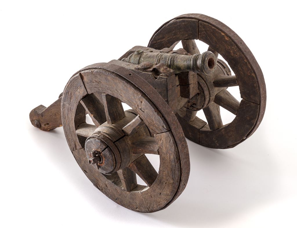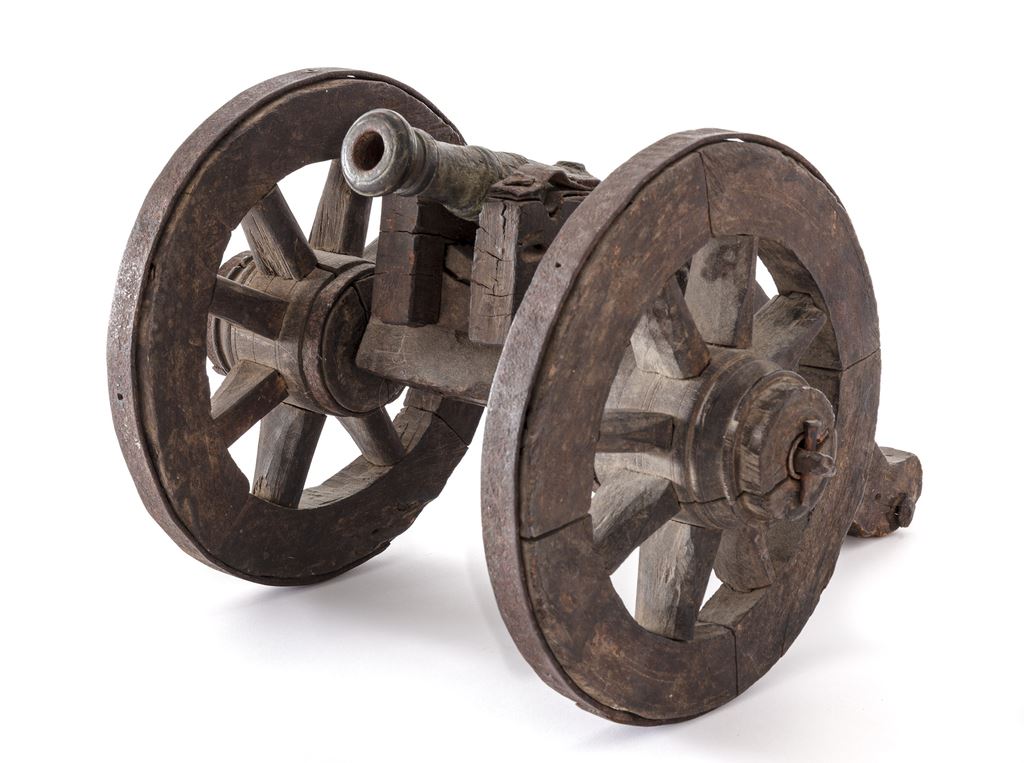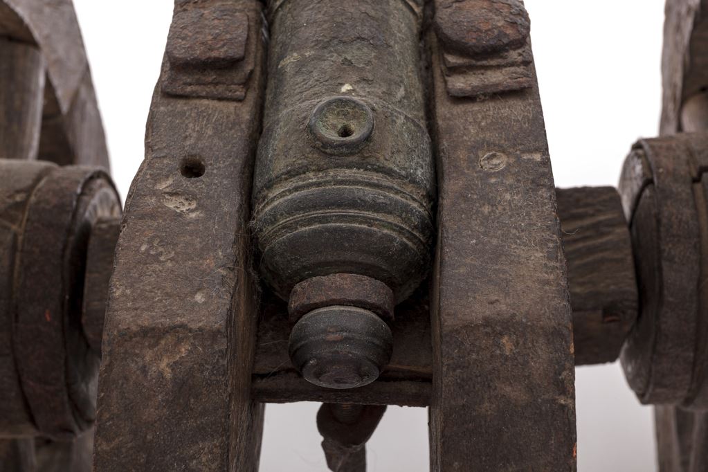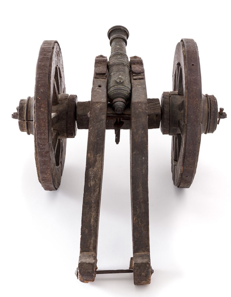 Small Firing Model of a Bronze Cannon, with Carriage, ca. 17th or 18th Century. Bore is approx. .750''; cannon is approx. 8-3/4'' long and approx. 1-3/4'' wide at the widest point; flared muzzle is approx. 1-3/4'' wide. Dark patina to the bronze body. There is a small touch hole and cup for priming powder. Cannon sits in a wooden carriage and is retained with very old iron straps and bolts that appear to be hand forged. Wood wheels have forged iron bands around the outside and around the inside of the hub. Wheels are approx. 12'' in dia. and approx. 20'' long from the front of the wheels to the rear of the central mounting foot. Condition is good, the wood showing a dark aged patina, with numerous scuffs, scrapes, dings, cracks, and chips. Iron straps and wheel parts have a heavy pitted old rust patina. Cannon has a dark patina with pitting or rough casting marks in the center. A very neat old model cannon. Est. $800-$1,200.