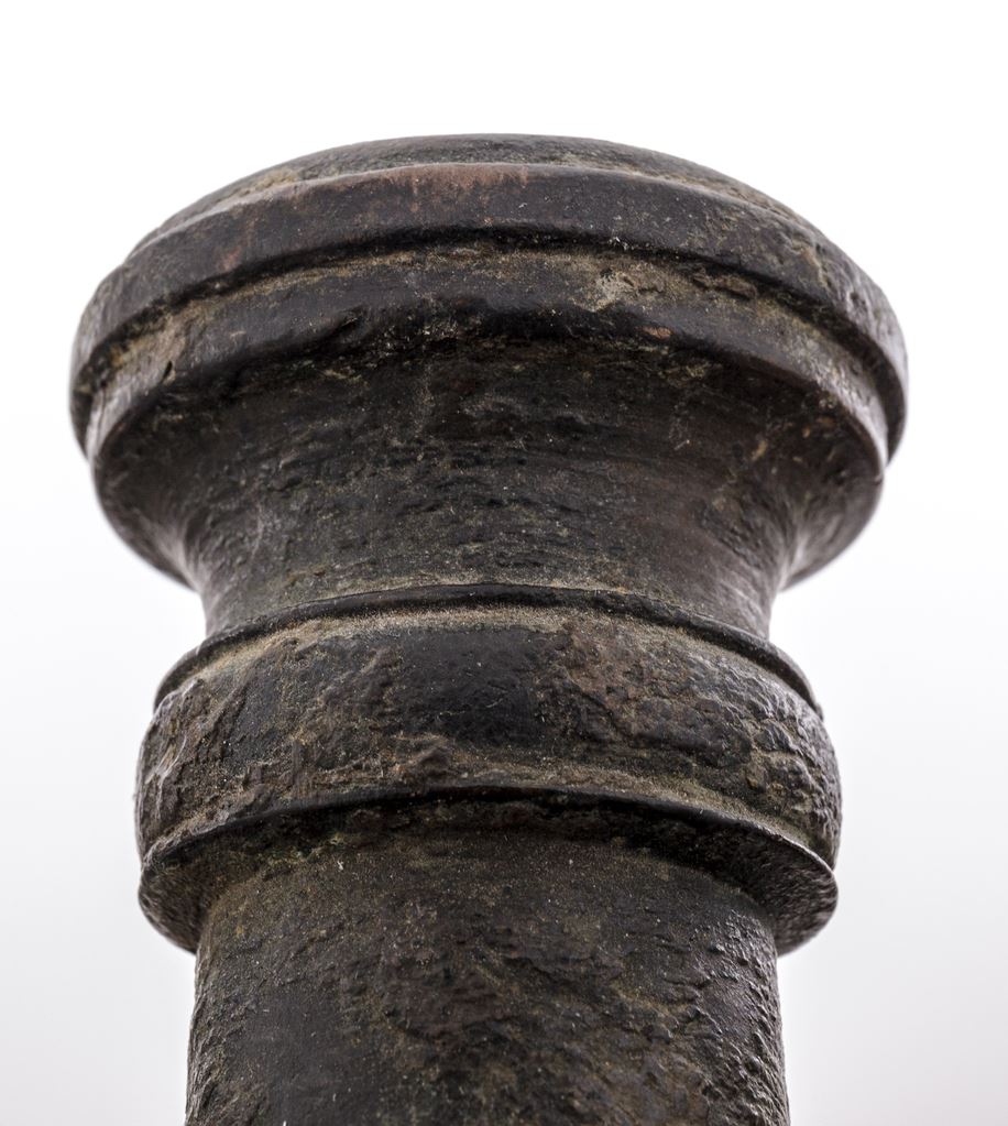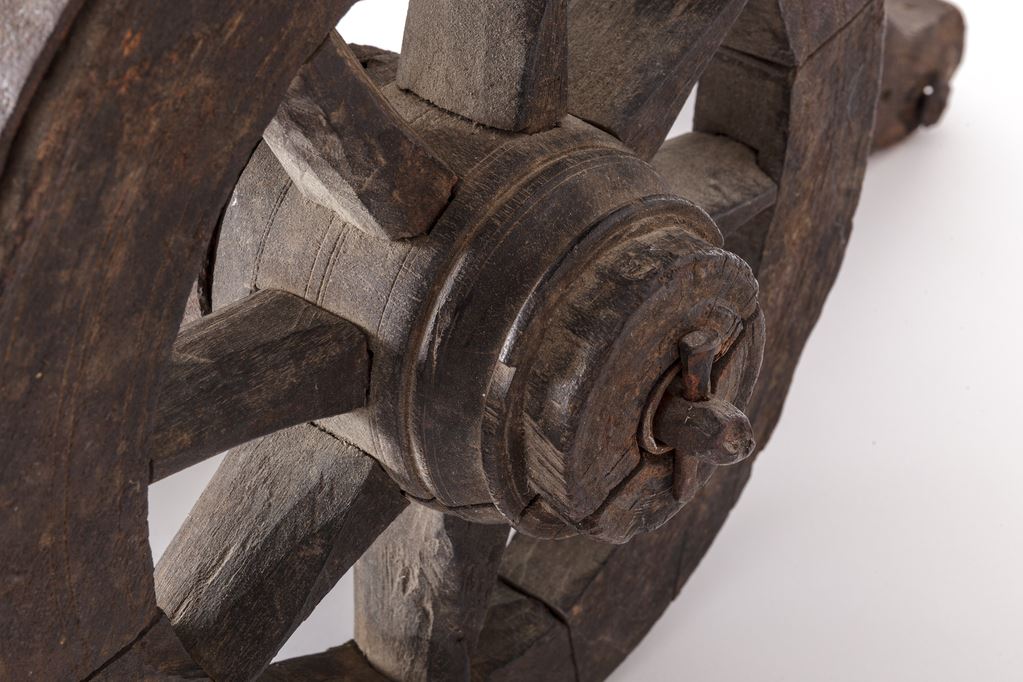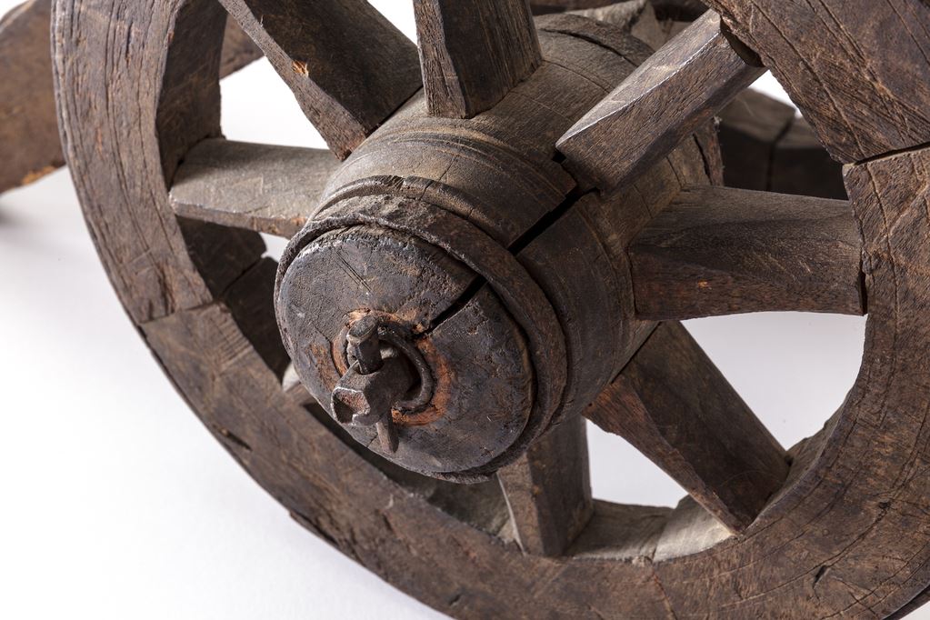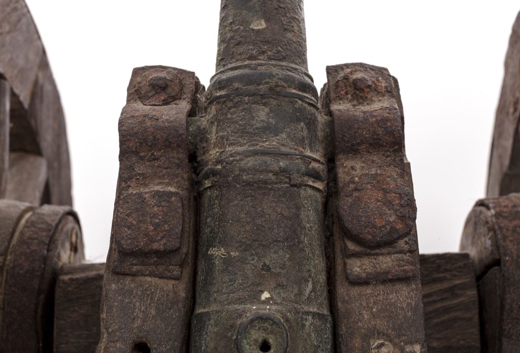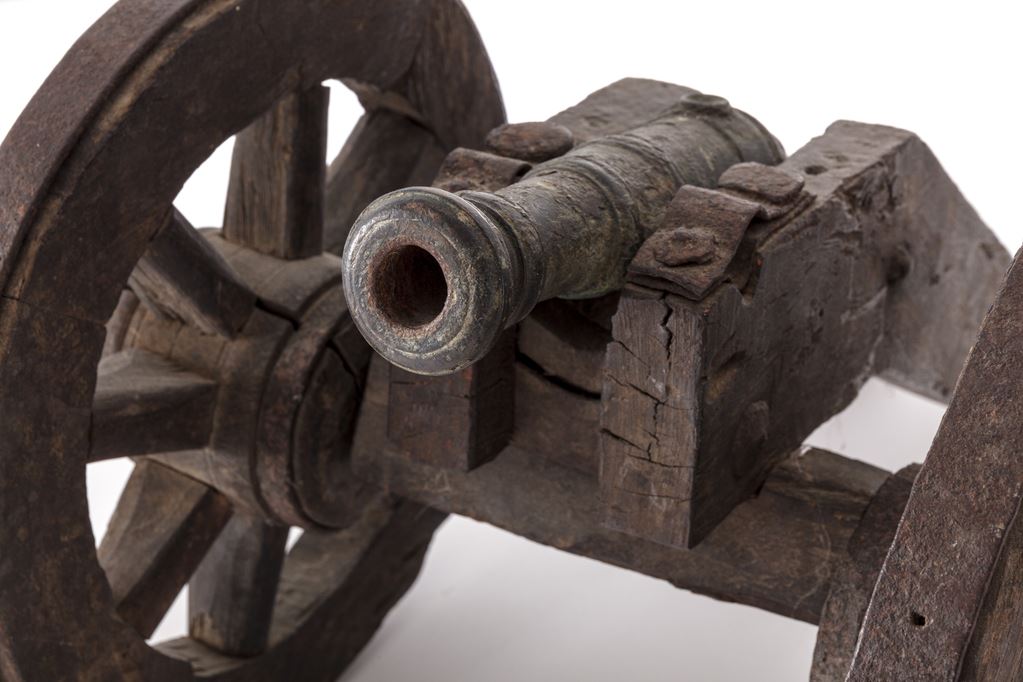Small Firing Model of a Bronze Cannon, with Carriage, ca. 17th or 18th Century. Bore is approx. .750''; cannon is approx. 8-3/4'' long and approx. 1-3/4'' wide at the widest point; flared muzzle is approx. 1-3/4'' wide. Dark patina to the bronze body. There is a small touch hole and cup for priming powder. Cannon sits in a wooden carriage and is retained with very old iron straps and bolts that appear to be hand forged. Wood wheels have forged iron bands around the outside and around the inside of the hub. Wheels are approx. 12'' in dia. and approx. 20'' long from the front of the wheels to the rear of the central mounting foot. Condition is good, the wood showing a dark aged patina, with numerous scuffs, scrapes, dings, cracks, and chips. Iron straps and wheel parts have a heavy pitted old rust patina. Cannon has a dark patina with pitting or rough casting marks in the center. A very neat old model cannon. Est. $800-$1,200.