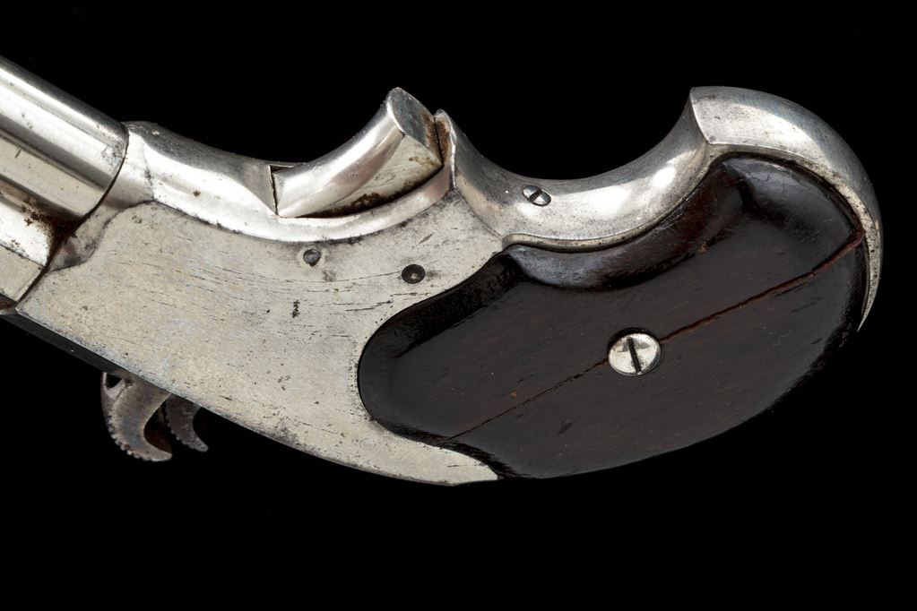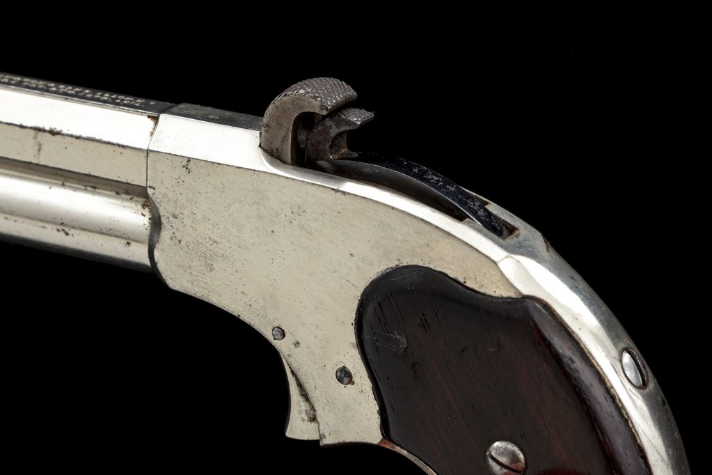 Antique Remington-Rider 5-Shot Magazine Pistol, NVSN, .32 Extra-Short RF, 3'' octagonal barrel is turned round for .25'' at muzzle, has front-loading cartridge magazine below and marked with maker's name and address/''Rider's Pat. Aug. 15th, 1871'' in two lines on top; frame has central breechblock and hammer, guard-less trigger and integral ''bird's head'' gripstraps, two-piece varnished rosewood grips. Mfg'd ca. 1871-88 in full nickel-plated finish with case hardened breechblock and hammer. Condition is near excellent retaining approx. 95% bright nickel overall, occasional very light marks, sharp edges and markings. Grips are smooth retaining most original varnish, the right panel showing a full-length crack at screw. Action is smooth (but does not hold cock); bore shows overall black-powder erosion and faint rifling. One of the first magazine repeating pistols, unadorned Remington-Riders like this one are scarcer than their engraved counterparts. Est.: $900-$1,200.(Antique)(John Ackerman collection)