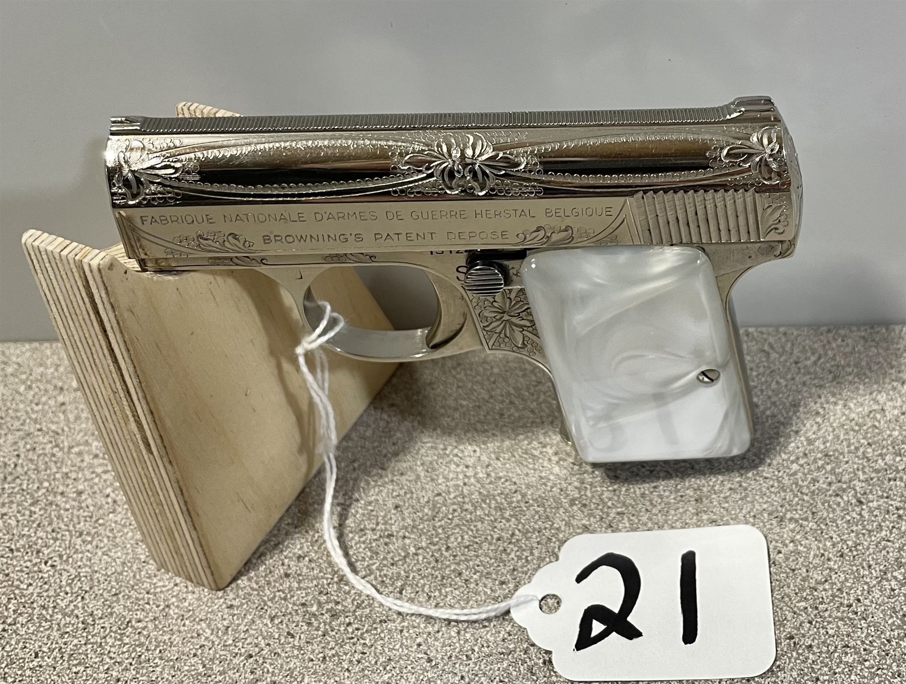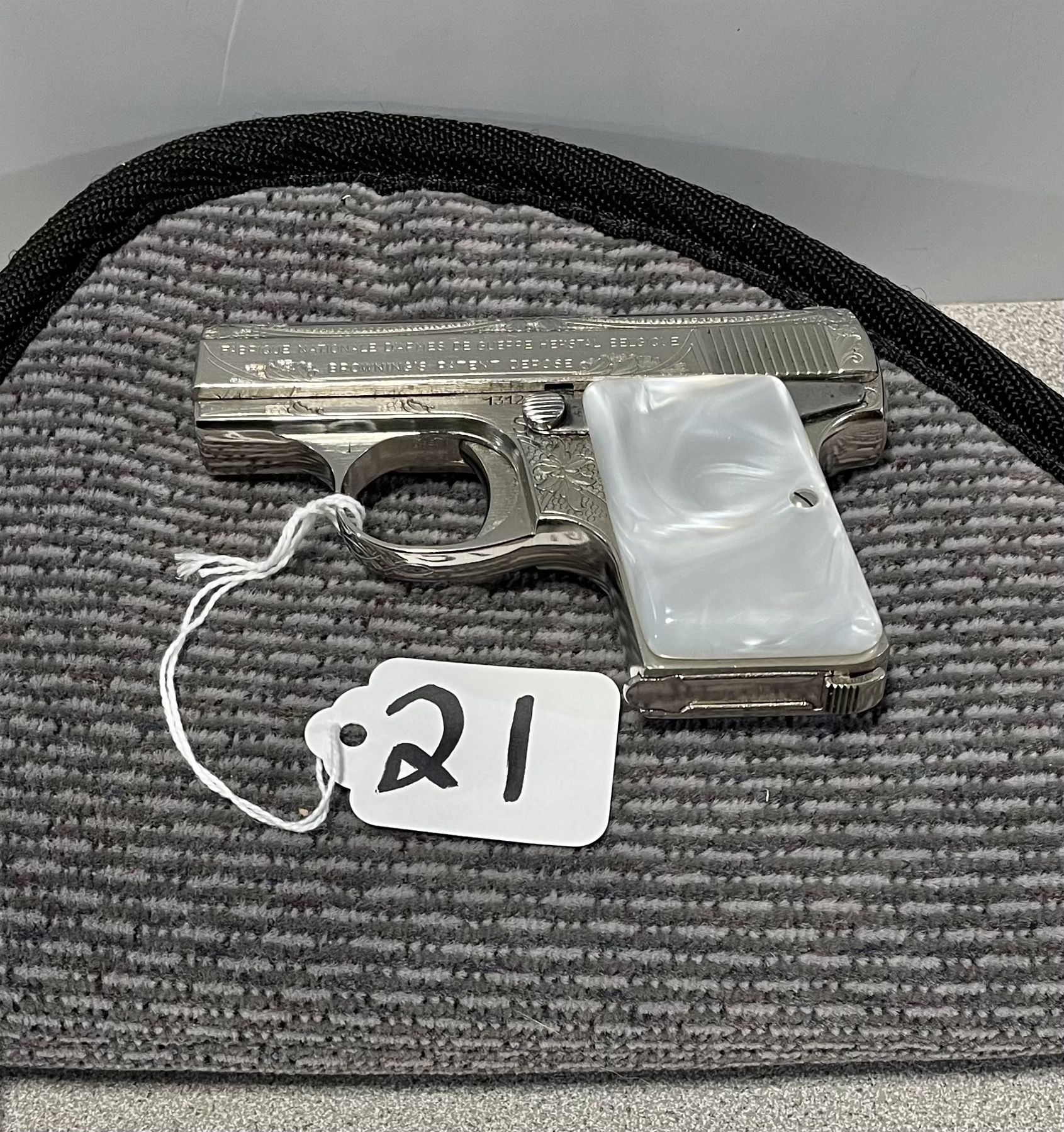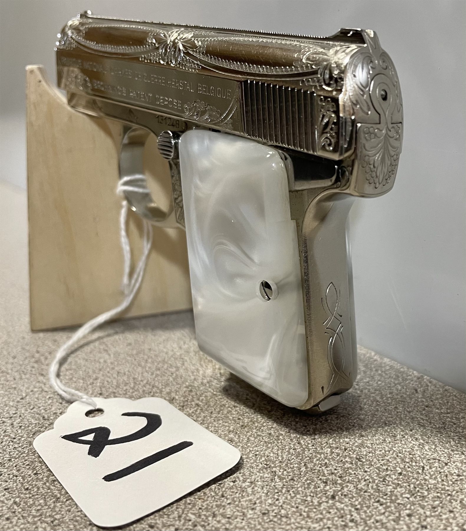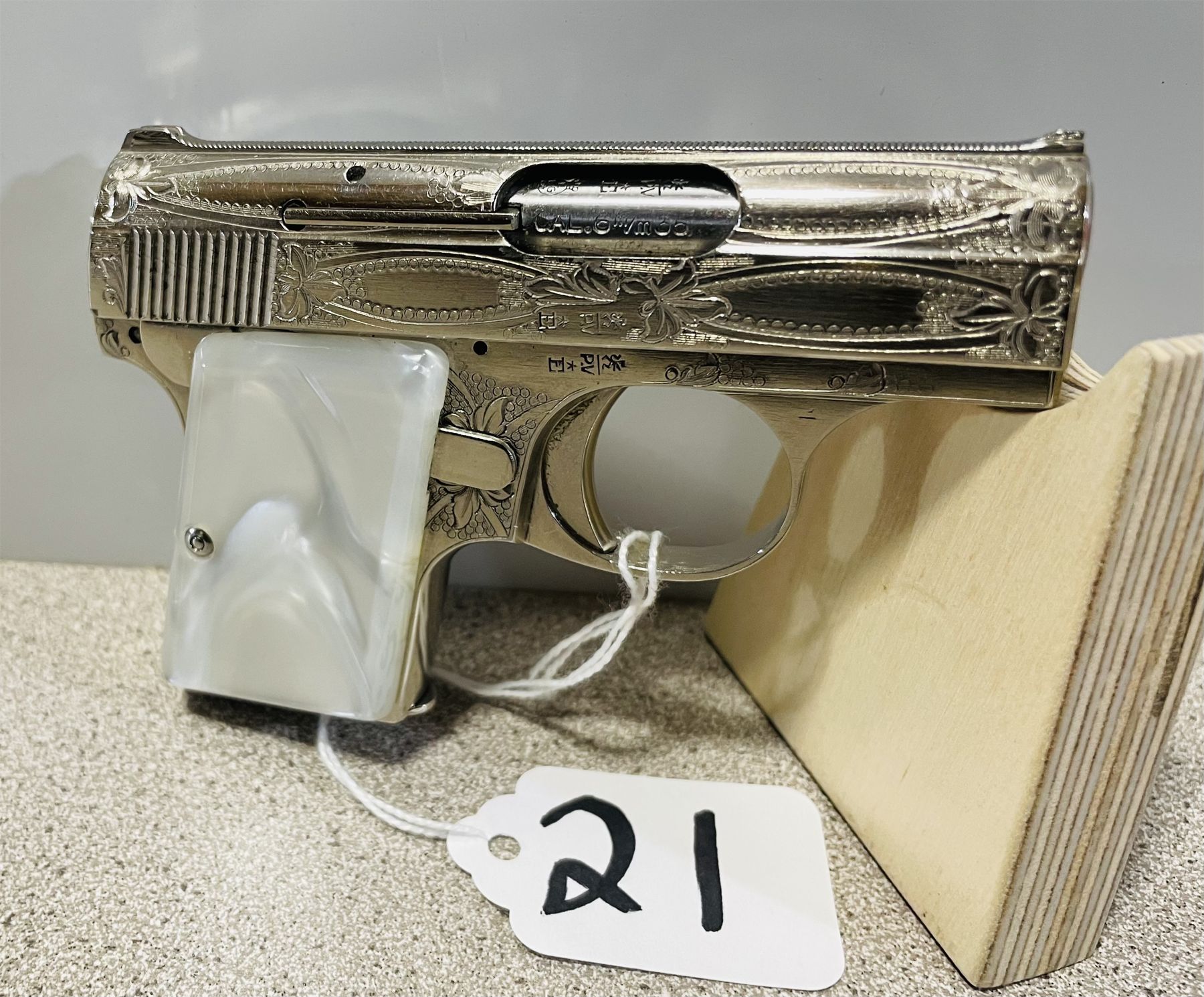 AN EXCELLENT BELGIAN MANUFACTURED PISTOL WITH FACTORY ENGRAVING, FLORAL & VINE PATTERN ON NICKEL PLATING. THE 2 INCH BARREL HAS CROSS HATCH RIB, FIXED SIGHTS. MOTHER OF PEARL GRIPS. OVERALL THIS FIREARM IS IN AS NEW CONDITION. S/N 131248. CND PROHIB CLASS. USA CURIO & RELIC CLASS.