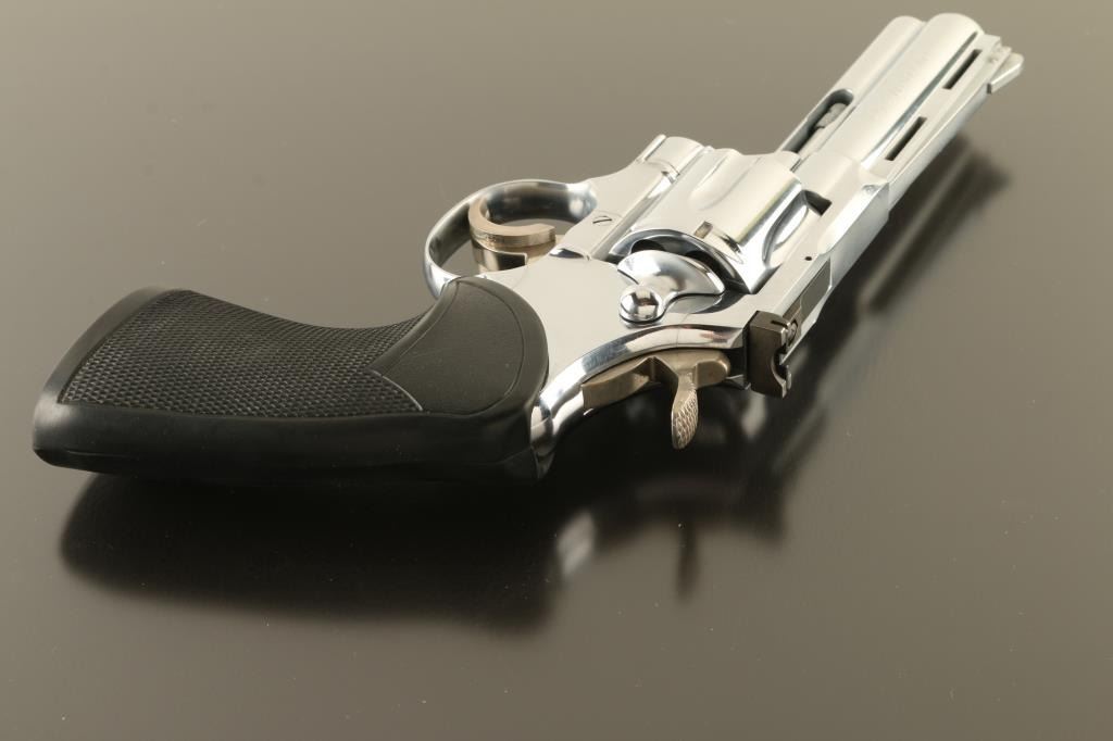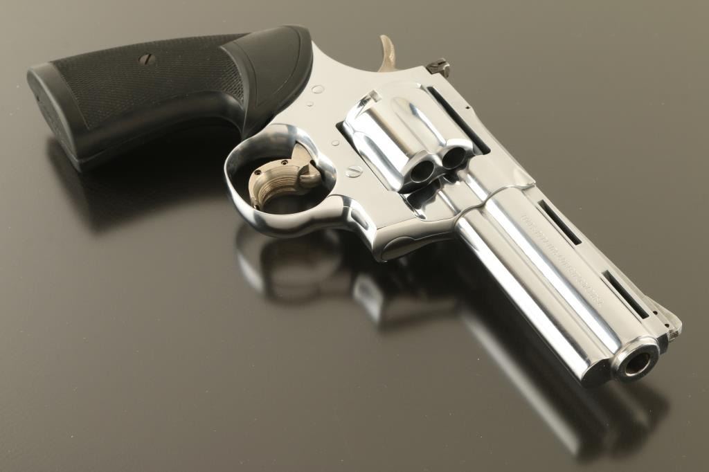 Double/single action revolver manufactured circa 1968. Features a Nickel refinish, black rubber Pachmayr two piece grips, 4" vent rib barrel with full length underlug, adjustable sights, wide trigger show added to narrow factory trigger, checkered wide spur hammer. Bore is excellent. Nickel finish is excellent. Grips are very good condition. Action is smooth, locks up tight.