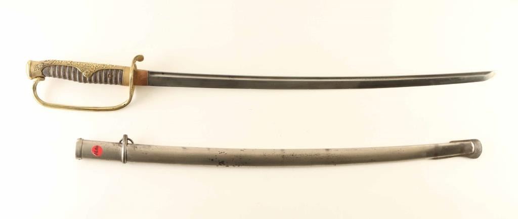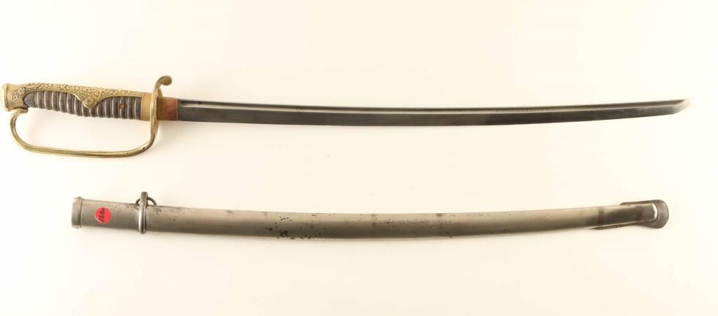 Type 19 WW2 Officers Kyu-Gunto sword. This sword is a Army Field Grade Sword (Major-Colonel) This is evidenced by the Cherry Blossom /Floral design on the back strap of the hilt. 26" blade. Rayskin, wire-wrapped grips. Brass plated pommel, backstrap, and guard. Missing the Cherry Blossom scabbard release button on right grip. Steel scabbard. Blade has a couple of small nicks to the edge.