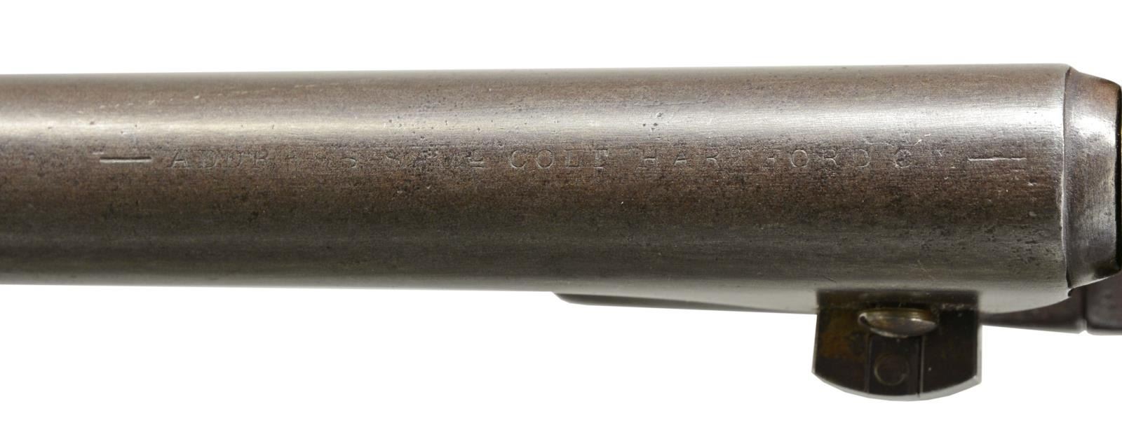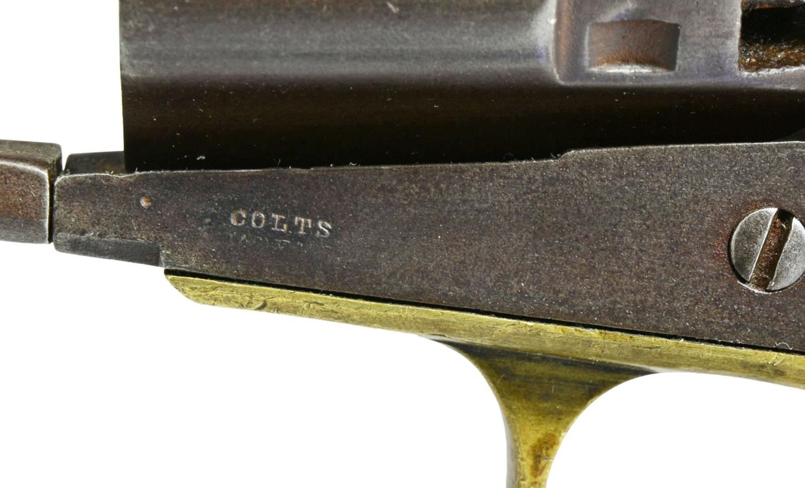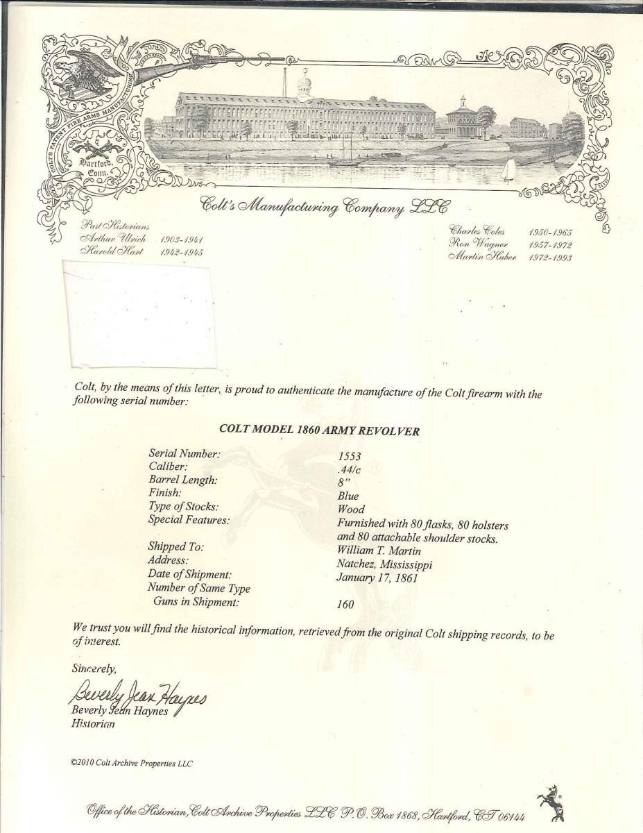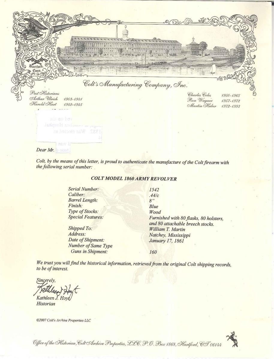 USED BY “JEFF DAVIS LEGION” AT GETTYSBURG AND OTHER BATTLES. Cal. 44. S# 1542/1553. Standard configuration, 8" barrels with 1 line Hartford address, German silver blade front sights. Colt Model 1860 fluted Army revolvers shipped to Natchez, Mississippi on January 17, 1861. This was part of 160 revolvers (80 pairs) shipped which originally had attachable shoulder stock for each pair, pommel holsters and flasks. Of all the known Colts shipped at beginning of Civil War to the South, Colonel Martin’s guns are the among the rarest and most historic. This pair being fine survivors, complete and original. There are less than 10 known survivors of the 160 shipped, most poor in condition. Fluted Army of Lt. Colonel William G. Conner still retains the shoulder stock and was captured at Gettysburg. This is an opportunity to buy an historic pair of documented Confederate used Colt fluted 1860 army revolvers of famous Confederate Cavalry unit. UNATTACHED ACCESSORIES: Colt factory letters confirming shipment to William Martin on January 17, 1861 and configuration of revolvers, small binder of research on Jeff Davis Legion and Col. Martin. Pair serial number 923/959 that were shipped to Richmond and carried by Confederate naval officer John Low were sold by James Julia auctions as lot 4362 in October 2016. James Julia auctions also sold the only other pair of pistols known shipped to William T. Martin, as lot 144, March 2001, S# 1224/1244. Subject pair are much higher condition than the other Martin pair sold in 2001. CONDITION: S# 1542 good-very good overall, appears complete and matching. Matching serial number is found on barrel, frame trigger guard, backstrap, wedge, arbor, and last 3 digits inked in backstrap channel of grips. Markings all discernible including patent and serial number on opposite flutes of cylinder, 1-line Hartford address is well discerned as is “COLT’S / PATENT” on left side of frame. Iron has a mostly smooth mottled gray/brown patina. Brass trigger guard has light mustard patina and stamped small “G” on left rear, the same “G” Colt assembly or inspection mark is also found on S# 1553. Grips are well fit, hand worn patina, moderate edge wear, light tacking make soldier’s initials difficult to discern. Mechanically fine with crisp discernible rifling. S# 1553 good overall, appears all matching and complete with exception of a few restored screws and wedge. Matching serial numbers are found on barrel, frame, trigger guard, backstrap, cylinder, and arbor. Restored wedge has matching number applied also. Markings all discernible though barrel address is light in areas, 2nd line of patent on frame is weakly struck. Patent marking and serial number in adjacent flutes on cylinder are well struck and well discerned. Original Colt grips are well fit with initials “PM” scratched in butt. Iron has been cleaned with smooth plum/light brown color. Brass has a mottled light mustard patina. Mechanically fine with crisp discernible rifling. (01-18916/JS). BOTH ANTIQUE. $25,000-35,000.