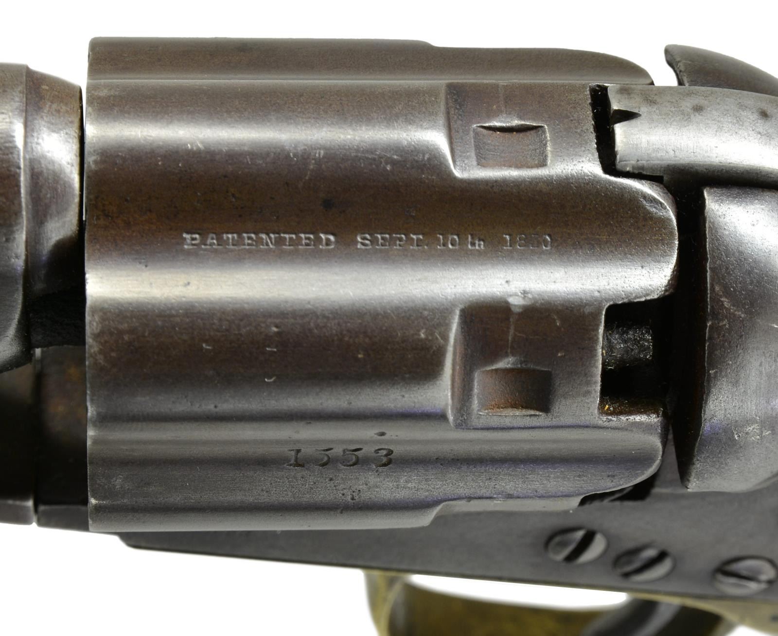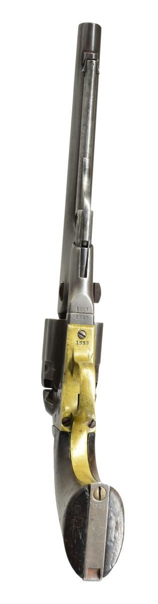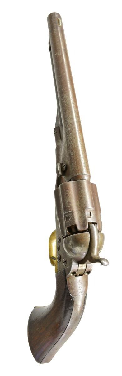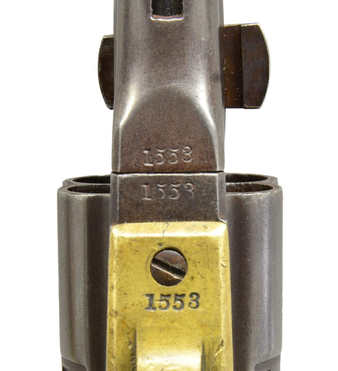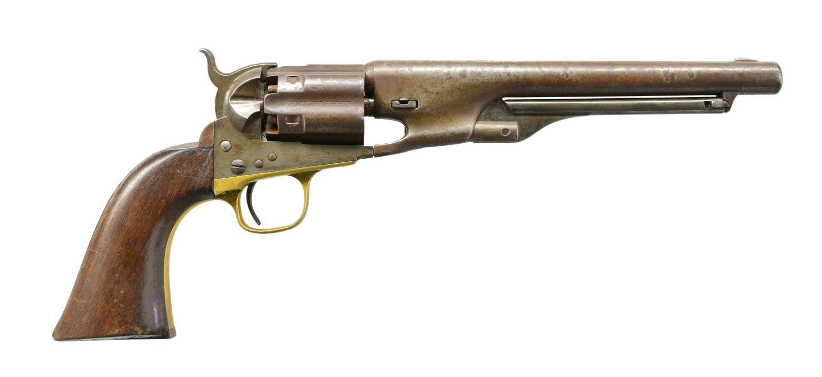 USED BY “JEFF DAVIS LEGION” AT GETTYSBURG AND OTHER BATTLES. Cal. 44. S# 1542/1553. Standard configuration, 8" barrels with 1 line Hartford address, German silver blade front sights. Colt Model 1860 fluted Army revolvers shipped to Natchez, Mississippi on January 17, 1861. This was part of 160 revolvers (80 pairs) shipped which originally had attachable shoulder stock for each pair, pommel holsters and flasks. Of all the known Colts shipped at beginning of Civil War to the South, Colonel Martin’s guns are the among the rarest and most historic. This pair being fine survivors, complete and original. There are less than 10 known survivors of the 160 shipped, most poor in condition. Fluted Army of Lt. Colonel William G. Conner still retains the shoulder stock and was captured at Gettysburg. This is an opportunity to buy an historic pair of documented Confederate used Colt fluted 1860 army revolvers of famous Confederate Cavalry unit. UNATTACHED ACCESSORIES: Colt factory letters confirming shipment to William Martin on January 17, 1861 and configuration of revolvers, small binder of research on Jeff Davis Legion and Col. Martin. Pair serial number 923/959 that were shipped to Richmond and carried by Confederate naval officer John Low were sold by James Julia auctions as lot 4362 in October 2016. James Julia auctions also sold the only other pair of pistols known shipped to William T. Martin, as lot 144, March 2001, S# 1224/1244. Subject pair are much higher condition than the other Martin pair sold in 2001. CONDITION: S# 1542 good-very good overall, appears complete and matching. Matching serial number is found on barrel, frame trigger guard, backstrap, wedge, arbor, and last 3 digits inked in backstrap channel of grips. Markings all discernible including patent and serial number on opposite flutes of cylinder, 1-line Hartford address is well discerned as is “COLT’S / PATENT” on left side of frame. Iron has a mostly smooth mottled gray/brown patina. Brass trigger guard has light mustard patina and stamped small “G” on left rear, the same “G” Colt assembly or inspection mark is also found on S# 1553. Grips are well fit, hand worn patina, moderate edge wear, light tacking make soldier’s initials difficult to discern. Mechanically fine with crisp discernible rifling. S# 1553 good overall, appears all matching and complete with exception of a few restored screws and wedge. Matching serial numbers are found on barrel, frame, trigger guard, backstrap, cylinder, and arbor. Restored wedge has matching number applied also. Markings all discernible though barrel address is light in areas, 2nd line of patent on frame is weakly struck. Patent marking and serial number in adjacent flutes on cylinder are well struck and well discerned. Original Colt grips are well fit with initials “PM” scratched in butt. Iron has been cleaned with smooth plum/light brown color. Brass has a mottled light mustard patina. Mechanically fine with crisp discernible rifling. (01-18916/JS). BOTH ANTIQUE. $25,000-35,000.
