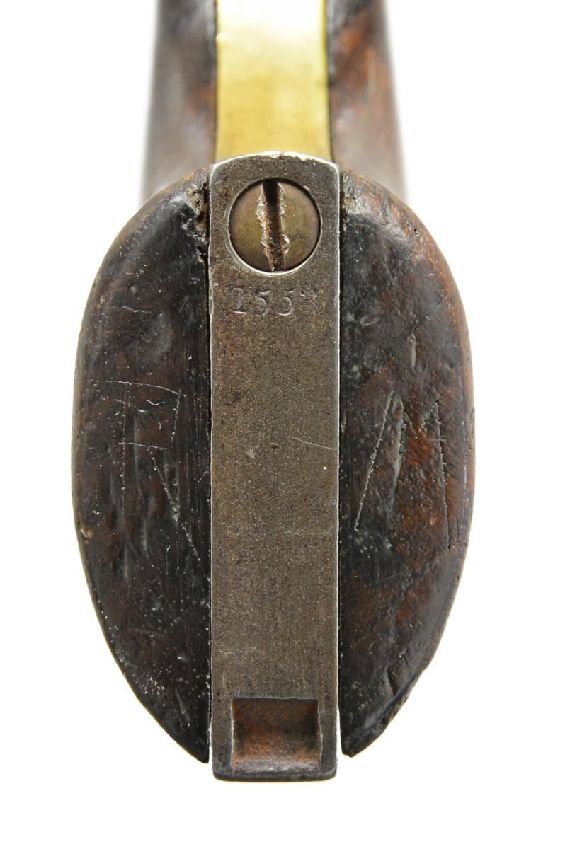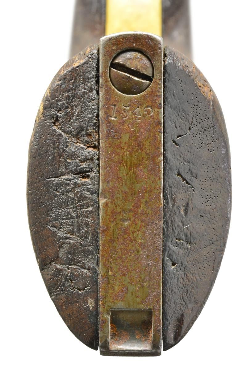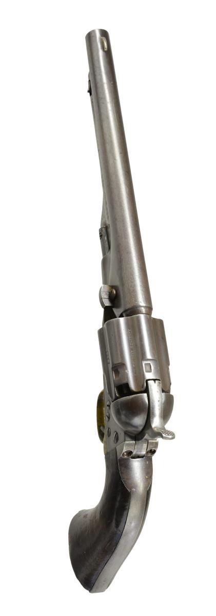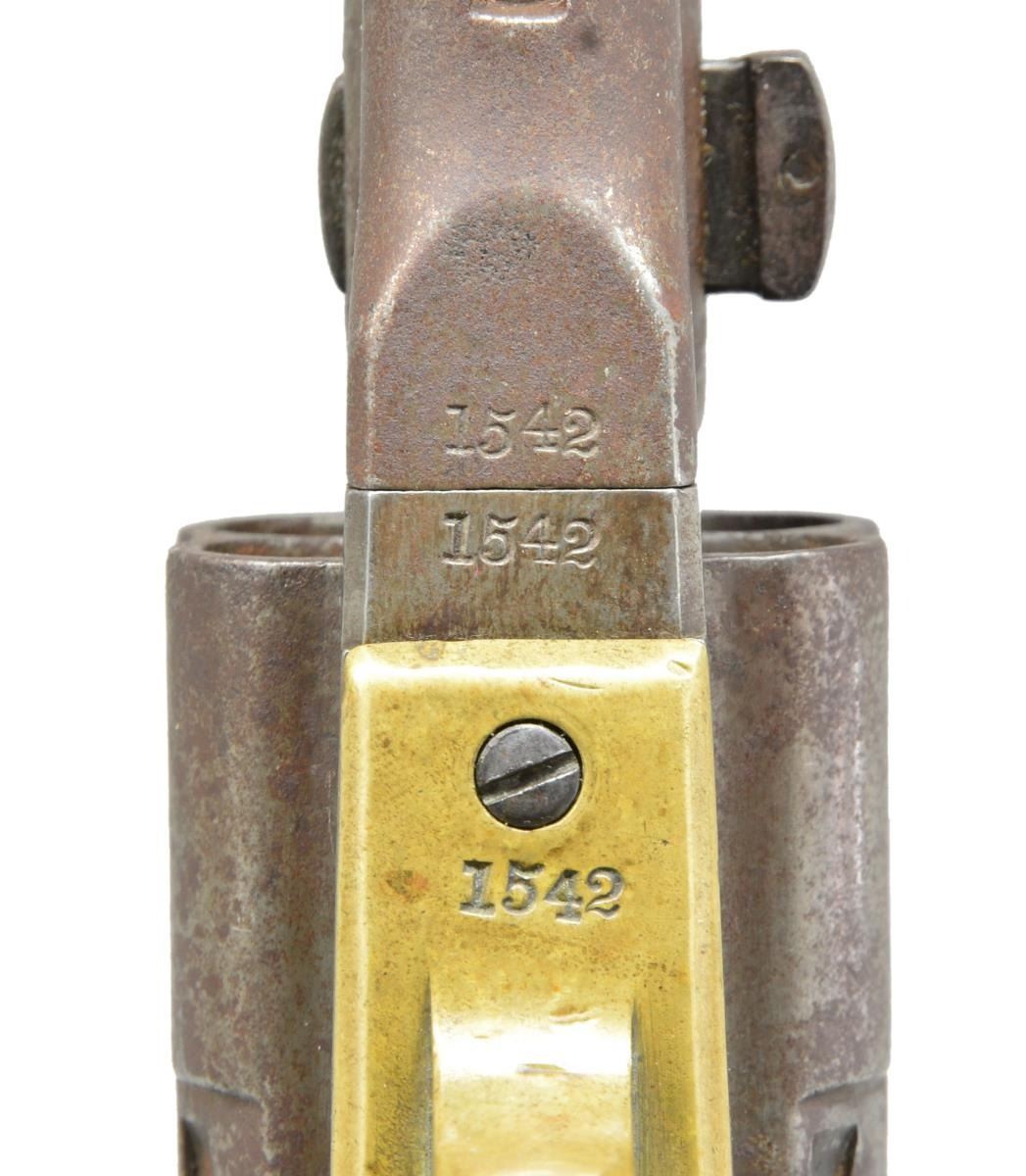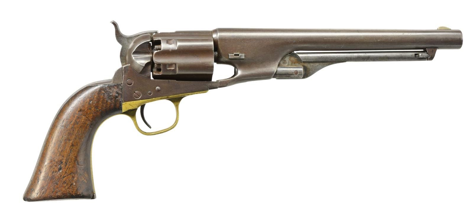 USED BY “JEFF DAVIS LEGION” AT GETTYSBURG AND OTHER BATTLES. Cal. 44. S# 1542/1553. Standard configuration, 8" barrels with 1 line Hartford address, German silver blade front sights. Colt Model 1860 fluted Army revolvers shipped to Natchez, Mississippi on January 17, 1861. This was part of 160 revolvers (80 pairs) shipped which originally had attachable shoulder stock for each pair, pommel holsters and flasks. Of all the known Colts shipped at beginning of Civil War to the South, Colonel Martin’s guns are the among the rarest and most historic. This pair being fine survivors, complete and original. There are less than 10 known survivors of the 160 shipped, most poor in condition. Fluted Army of Lt. Colonel William G. Conner still retains the shoulder stock and was captured at Gettysburg. This is an opportunity to buy an historic pair of documented Confederate used Colt fluted 1860 army revolvers of famous Confederate Cavalry unit. UNATTACHED ACCESSORIES: Colt factory letters confirming shipment to William Martin on January 17, 1861 and configuration of revolvers, small binder of research on Jeff Davis Legion and Col. Martin. Pair serial number 923/959 that were shipped to Richmond and carried by Confederate naval officer John Low were sold by James Julia auctions as lot 4362 in October 2016. James Julia auctions also sold the only other pair of pistols known shipped to William T. Martin, as lot 144, March 2001, S# 1224/1244. Subject pair are much higher condition than the other Martin pair sold in 2001. CONDITION: S# 1542 good-very good overall, appears complete and matching. Matching serial number is found on barrel, frame trigger guard, backstrap, wedge, arbor, and last 3 digits inked in backstrap channel of grips. Markings all discernible including patent and serial number on opposite flutes of cylinder, 1-line Hartford address is well discerned as is “COLT’S / PATENT” on left side of frame. Iron has a mostly smooth mottled gray/brown patina. Brass trigger guard has light mustard patina and stamped small “G” on left rear, the same “G” Colt assembly or inspection mark is also found on S# 1553. Grips are well fit, hand worn patina, moderate edge wear, light tacking make soldier’s initials difficult to discern. Mechanically fine with crisp discernible rifling. S# 1553 good overall, appears all matching and complete with exception of a few restored screws and wedge. Matching serial numbers are found on barrel, frame, trigger guard, backstrap, cylinder, and arbor. Restored wedge has matching number applied also. Markings all discernible though barrel address is light in areas, 2nd line of patent on frame is weakly struck. Patent marking and serial number in adjacent flutes on cylinder are well struck and well discerned. Original Colt grips are well fit with initials “PM” scratched in butt. Iron has been cleaned with smooth plum/light brown color. Brass has a mottled light mustard patina. Mechanically fine with crisp discernible rifling. (01-18916/JS). BOTH ANTIQUE. $25,000-35,000.
