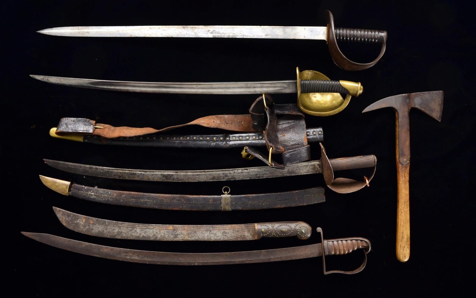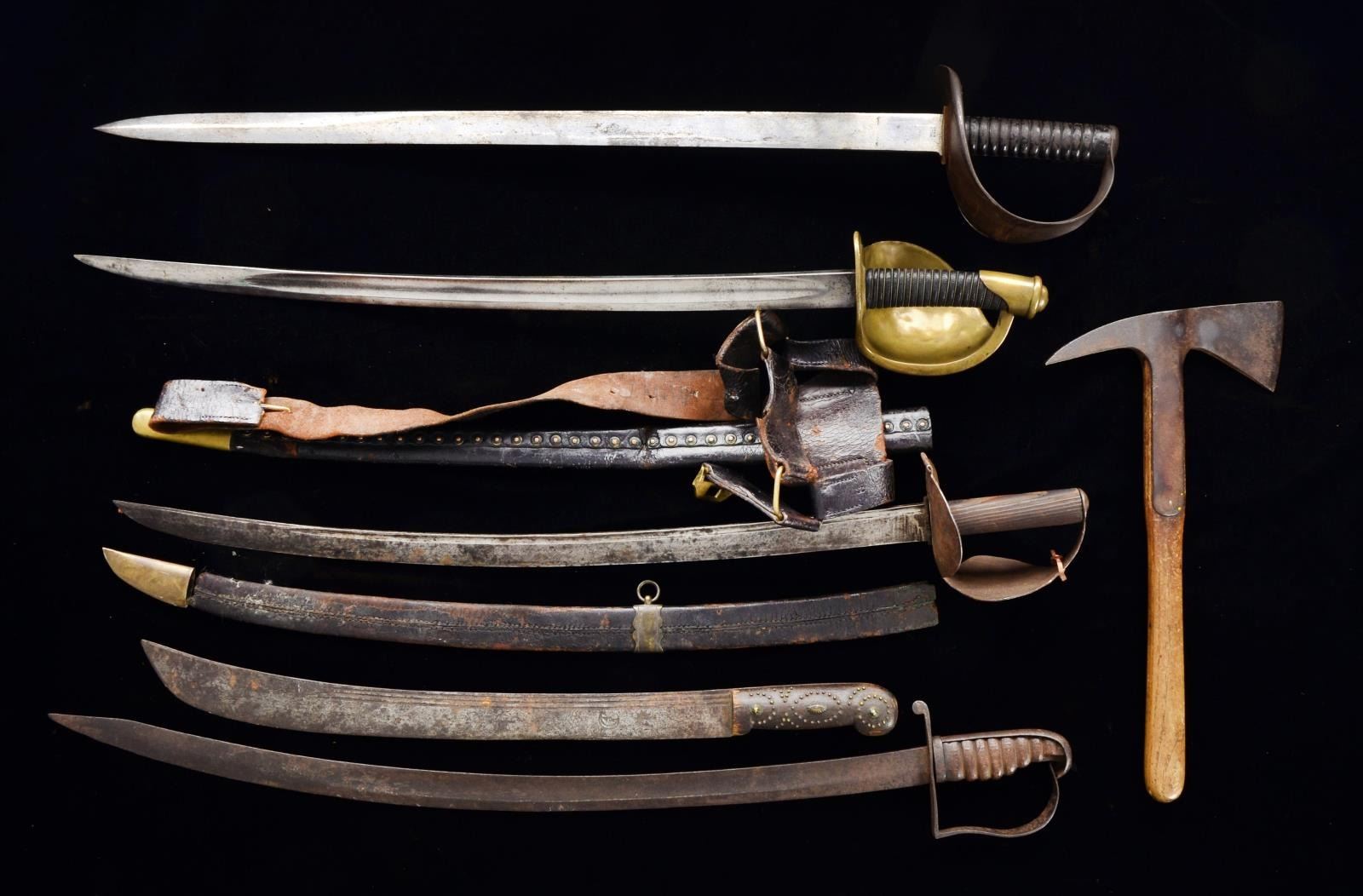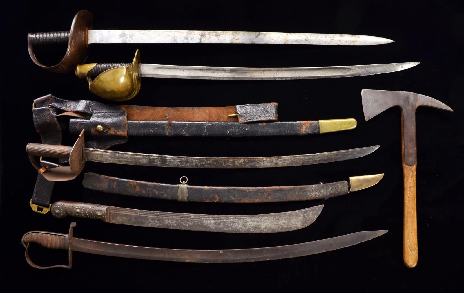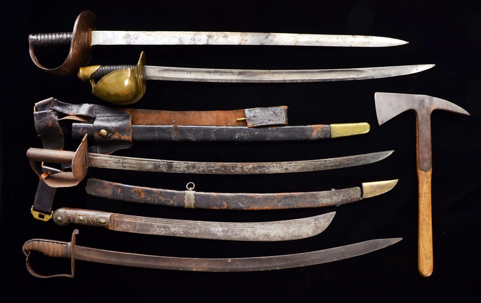 1) BRITISH FIRE/NAVAL AX. Overall length: 16". Head width: 8 1/2". Iron head w/ 6 3/4" ears down each side. Blade marked, “C.C / M”. Wooden handle appears to be oak. CONDITION: iron has a dark patina. Light wear overall. 2) BRITISH NAVAL CUTLASS. Overall length: 33 1/2". Blade length: 28 1/4". Plain blade marked at the ricasso, “MOLE BIRMM”. Iron hilt. Black painted iron grip. No scabbard. CONDITION: light wear overall. 3) MACHETE. Overall length: 25". Blade length: 19 3/4". Triple fullered blade w/ 3 talismans. 2 Piece wood grip w/ brass stud decoration. No scabbard. CONDITION: blade has a dark mottled patina. Grip shows moderate wear. 4) NAVAL CUTLASS. Overall length: 32 1/2". Blade length: 26 1/2". Single fullered curved blade. Figure 8 iron guard. Wood grip. Brass mounted leather scabbard. CONDITION: blade has a medium gray, cleaned, mottled finish. Guard has a deep dark patina. Wood grip is replaced. Scabbard shows heavy wear & is missing the throat. Scabbard has doubtful association w/ the cutlass. 5) M1860 US NAVAL CUTLASS. Overall length: 32 3/4". Blade length: 25 3/4". Single fullered blade marked at the ricasso, “Made by AMES MFG CO CHICOPEE MASS” & “186_”. Brass cup hilt stamped at the front of the hilt, “11M / 698”. Wire wrapped leather grip. Riveted leather scabbard w/ added brass tip. Scabbard includes a frog & belt belonging to an artillery sword belt for an 1832 short sword utilizing an M1851 belt plate. CONDITION: sword shows light wear overall. Scabbard shows moderate to heavy wear but remains in 1 piece. Belt & frog also show moderate to heavy wear. There is no buckle but the keeper is present. 6) ARTILLERY SABER. Overall length: 33 1/2". Blade length: 29". Single fullered blade. Iron hilt. Wood grip. CONDITION: sword has an overall dark patina. No leather or wire on grip. Wood is 85% intact. (02-14242(6)/BF). $1,000-1,600.