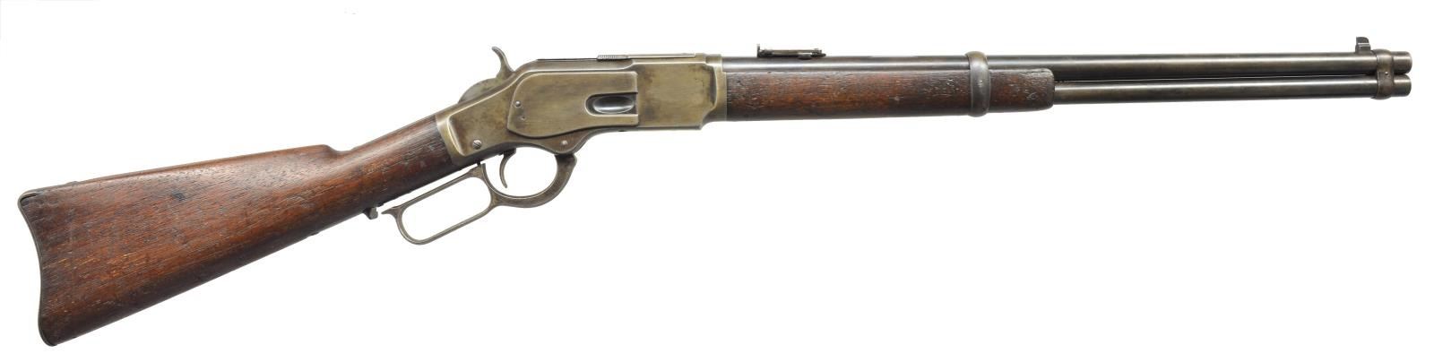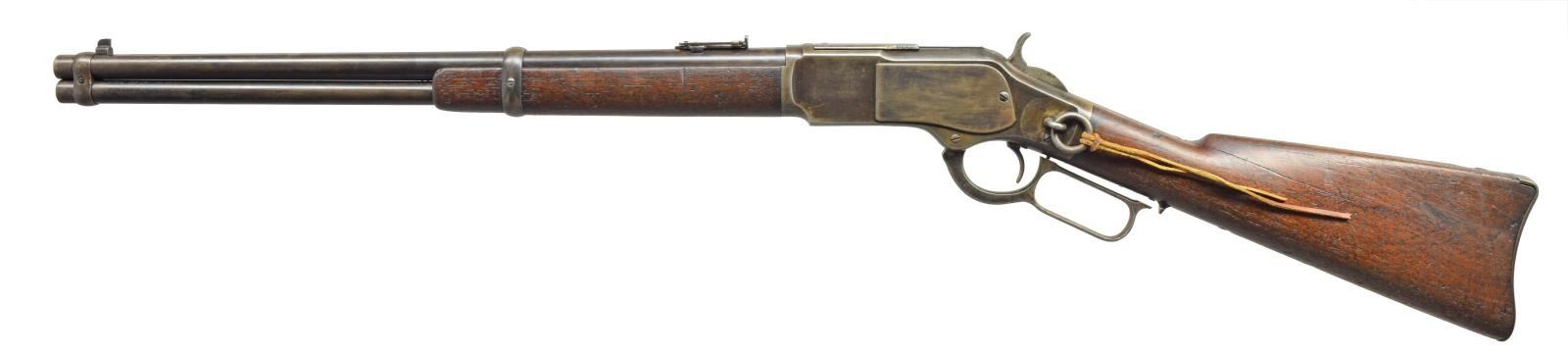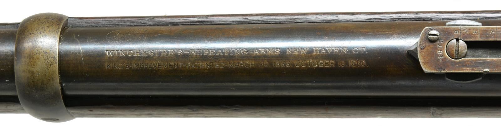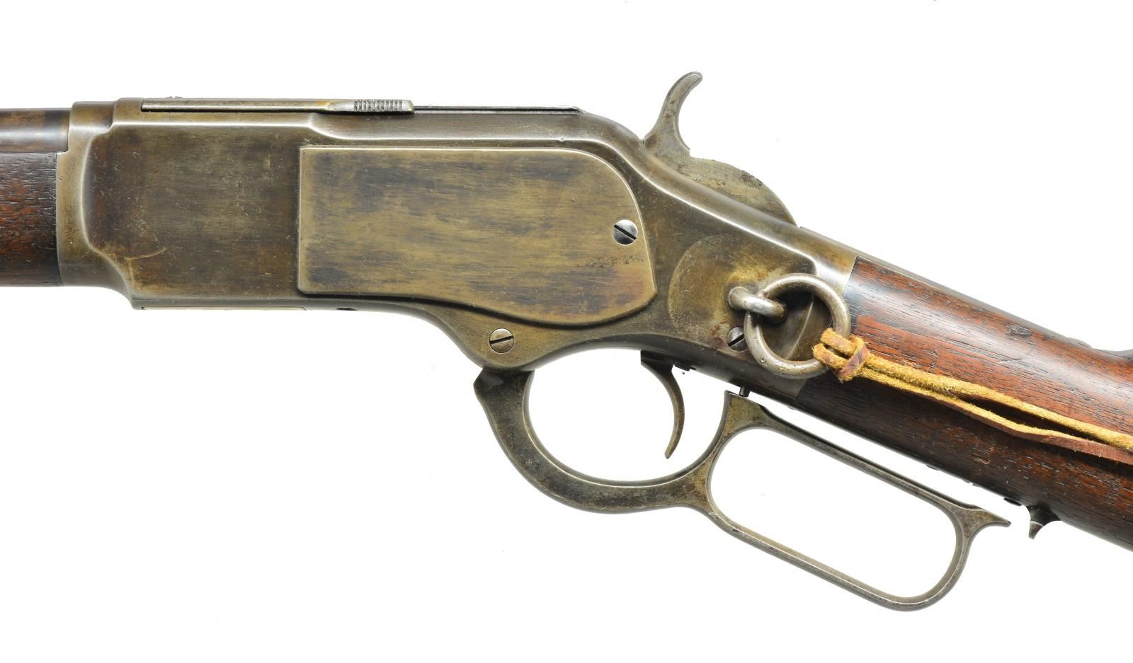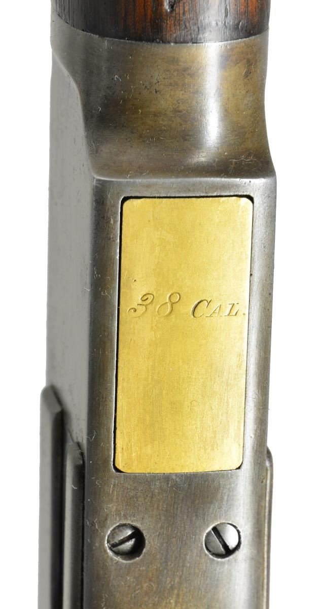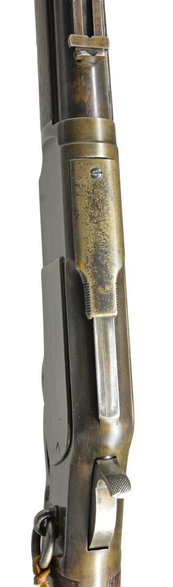 Cal. 38 WCF. S# 202257B. Bbl. 20" rnd. Square base w/ blade front sight & dovetail ladder adj. rear sight. Uncheckered forend. Left side of receiver has staple in ring. Uncheckered straight grip stock w/ steel carbine buttplate w/ trapdoor. Trap door contains 3 piece steel cleaning rod w/ brass tip. UNATTACHED ACCESSORIES: Cody Firearms Museum Records Office research form. CONDITION: bbl. retains original blue blending w/ brown patina. Receiver has original blue blending w/ brown patina & wear on sharp edges. Forend has hand worn original finish w/ a sm. dent & handling marks. Left side of receiver has faint saddle ring mark. Stock has open grain finish w/ handling marks & a grain crack running from top tang below comb down to center of left side. Bore is dark w/ moderate scattered pitting. (01-17882/BT). ANTIQUE. $3,000-4,000.