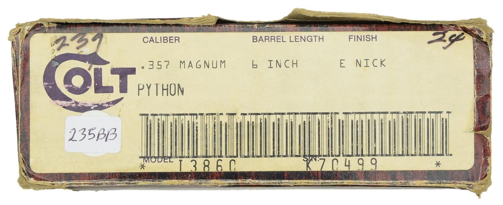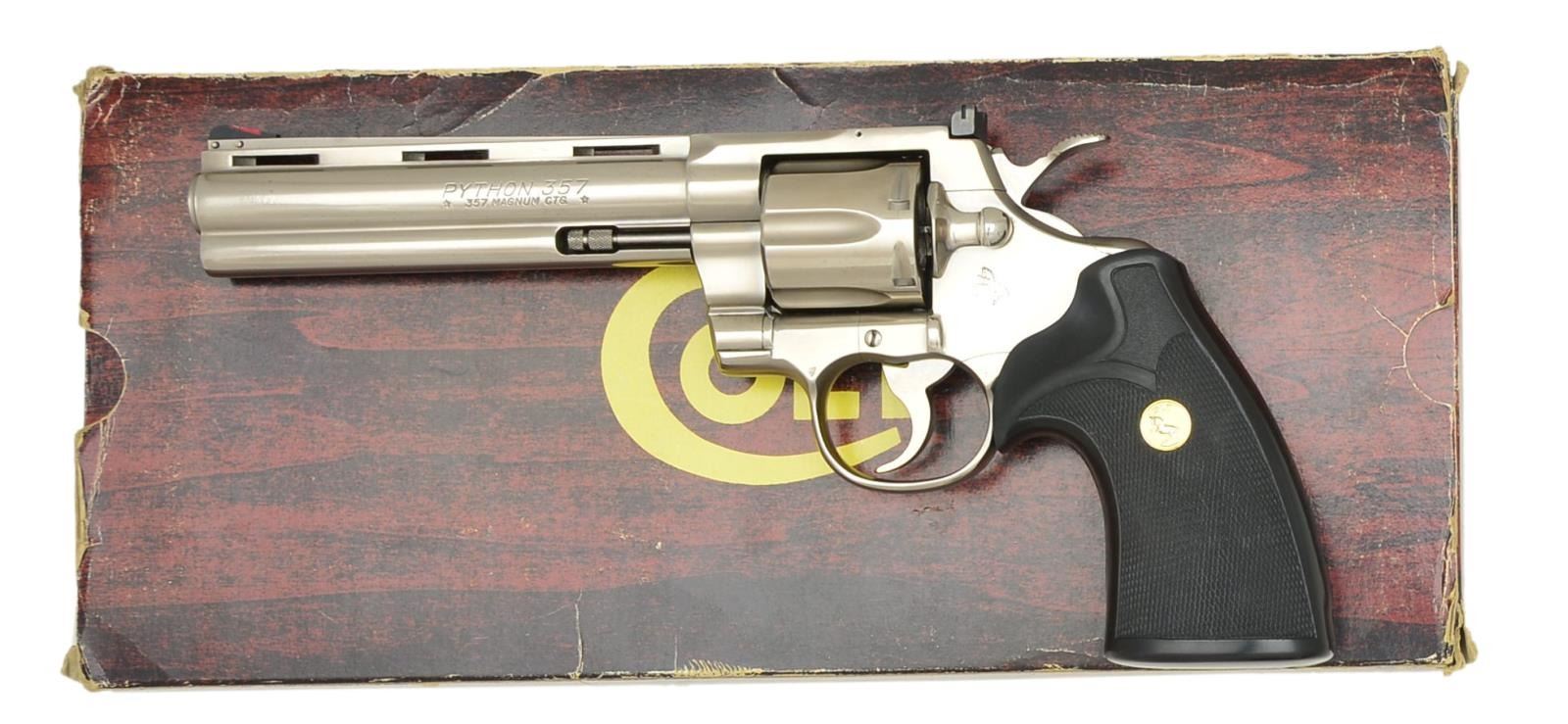 Cal. 357 Mag. S# K70499. Bbl. 6" w/full lug & VR. Red ramp serrated front sight w/ white outline square notch adj. rear sight. 6 Shot fluted cyl. Electroless nickel finish w/ Rampant Colt on side plate. Pachmayr Presentation rubber grips w/ gold Rampant Colt medallions. 1981 Mfg. UNATTACHED ACCESSORIES: foam lined wood grain box w/ matching label. Box contains instruction manual & congratulations letter. CONDITION: over 98% finish showing a cyl. drag line. Grips show light wear. Bright near excellent bore. (21-1526/DS). MODERN. $3,000-4,000.