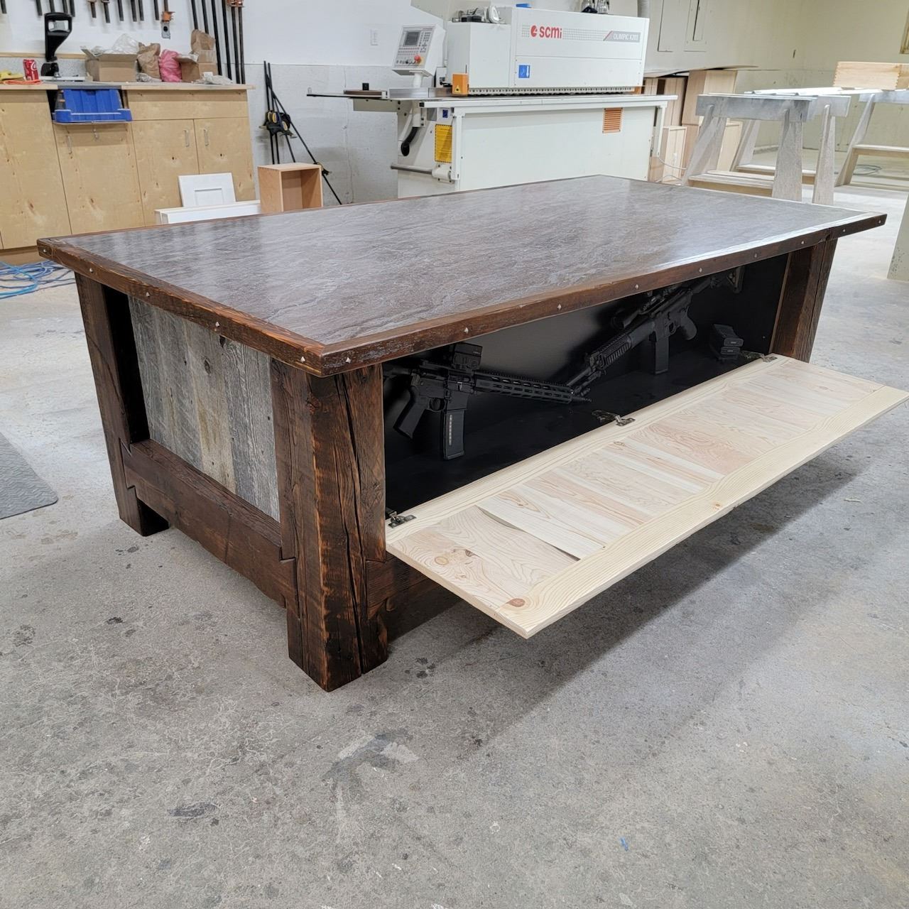 Chapter member Steve Reiling has donated this one-of-a-kind handmade desk crafted from reclaimed Douglas Fir. This desk has a hidden gun compartment! The dimensions are 85.5 wide by 44 deep by 30.5 inches high. This beautiful masterpiece can be yours. NOTE: Guns in picture ARE NOT included. Alpine Woodworks 406-799-8100 We thank Steve for his donation. Value: $$$Priceless$$$