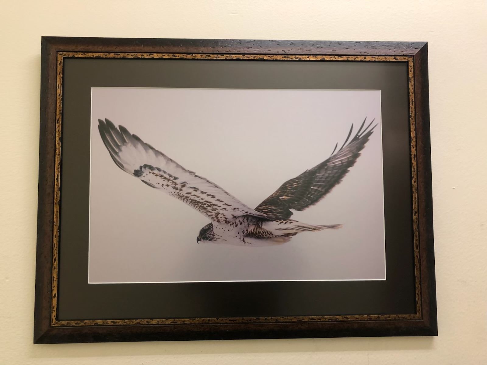 Lot 31 Four Corners Chapter SCI Print of the year is a framed red-tailed hawk Sponsored by: Legit Outdoors