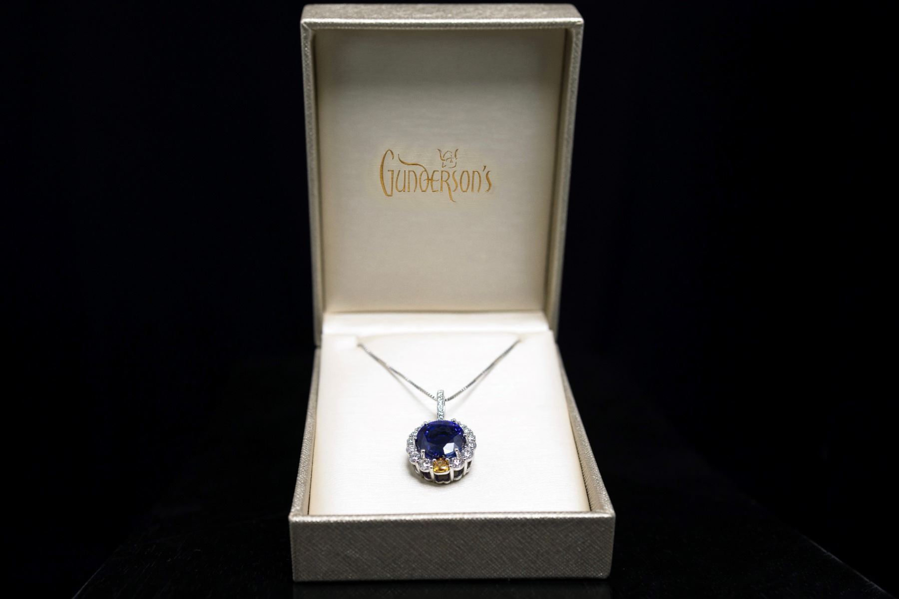 This stunning, one-of-a-kind turquoise beaded necklace set not only features custom-made diamond rondelle beads, but also a convertible tanzanite pendant attached at the center. The turquoise beads, weighing a total 18.71ct, show rich and vibrant color against natural gold inclusions. The four handmade diamond incrusted rondelles are spaced evenly amongst the turquoise beads. In the center is attached a convertible pendant; a tanzanite in the center is framed by a halo of 2ct of fine white diamonds tapering in size. At the bottom of that frame sits one natural yellow-orange trillion shaped faceted diamond weighing .47ct. Simply remove the safety latch of the convertible pendant and wear it on the included 14kt, 18-inch box-style chain for a whole new look! The entire diamond weight of this impeccable piece of art is approximately 10 carats and is appraised at $75,000. DSC FOUNDATION THANKS GUNDERSON'S JEWELERS FOR THIS 100% DONATION. Breanne Demers, 712-255-7229, 4830 Sergeant Road, Sioux City, IA 57038, breanne.demers@gundersons.com, Gundersons.Com.