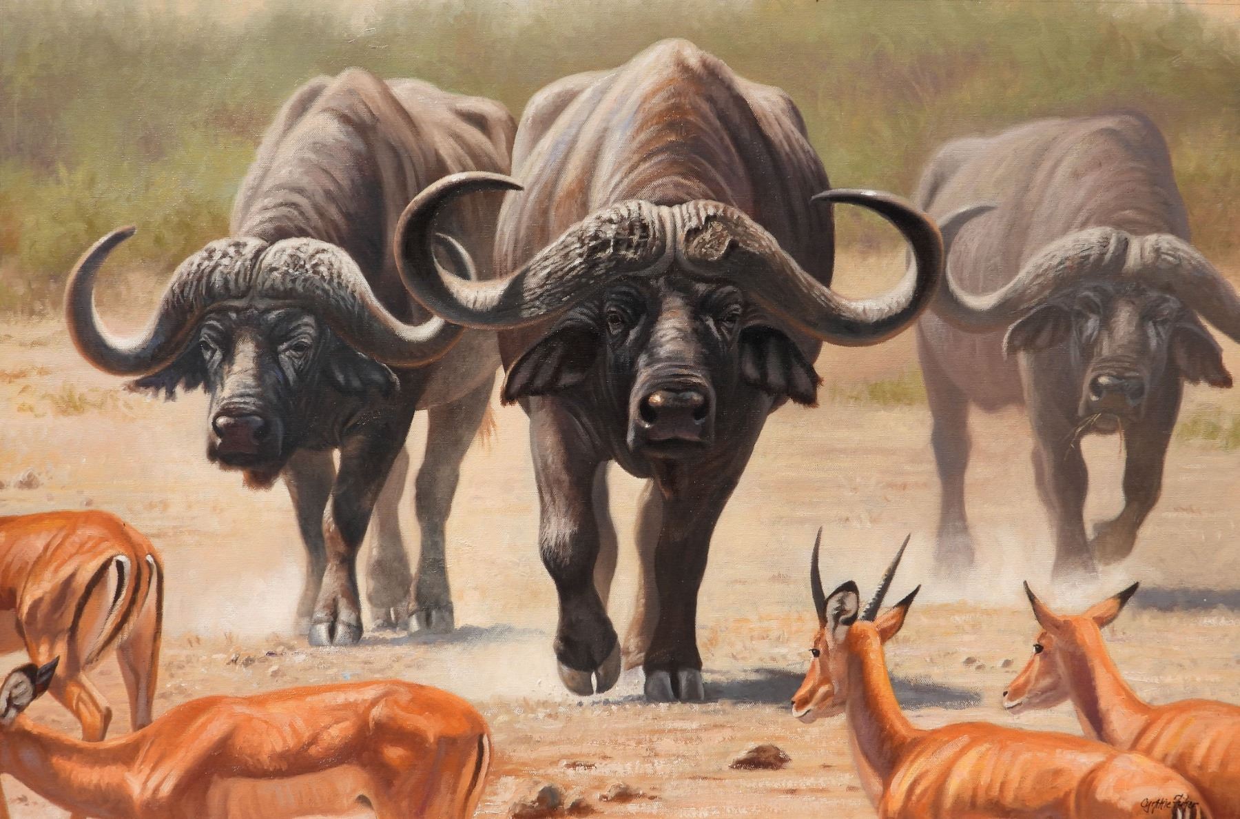 "The Boss" - original oil on canvas by Cynthie Fisher, measures 36x24. Cynthie, after all her trips to Africa, holds the Cape buffalo in very high esteem. She watched these bulls come to a waterhole in Kenya and was amazed at how big they were, especially the lead bull. There was nothing as impressive as observing this huge old dagga boy coming out of the bush, with horns so wide and heavy, she knew she had to paint him. This original oil painting will be a wonderful inspiration and addition to any home. Cynthie Fisher, 406-375-1445, 651 Bobcat Lane, Hamilton, MT 59840, cynthieart@gmail.com, CynthieFisher.Com.