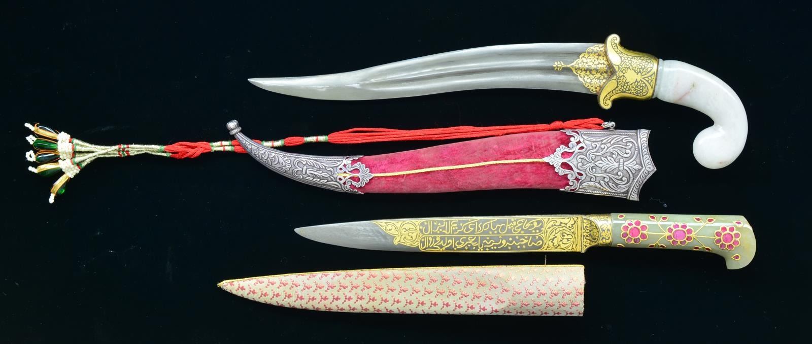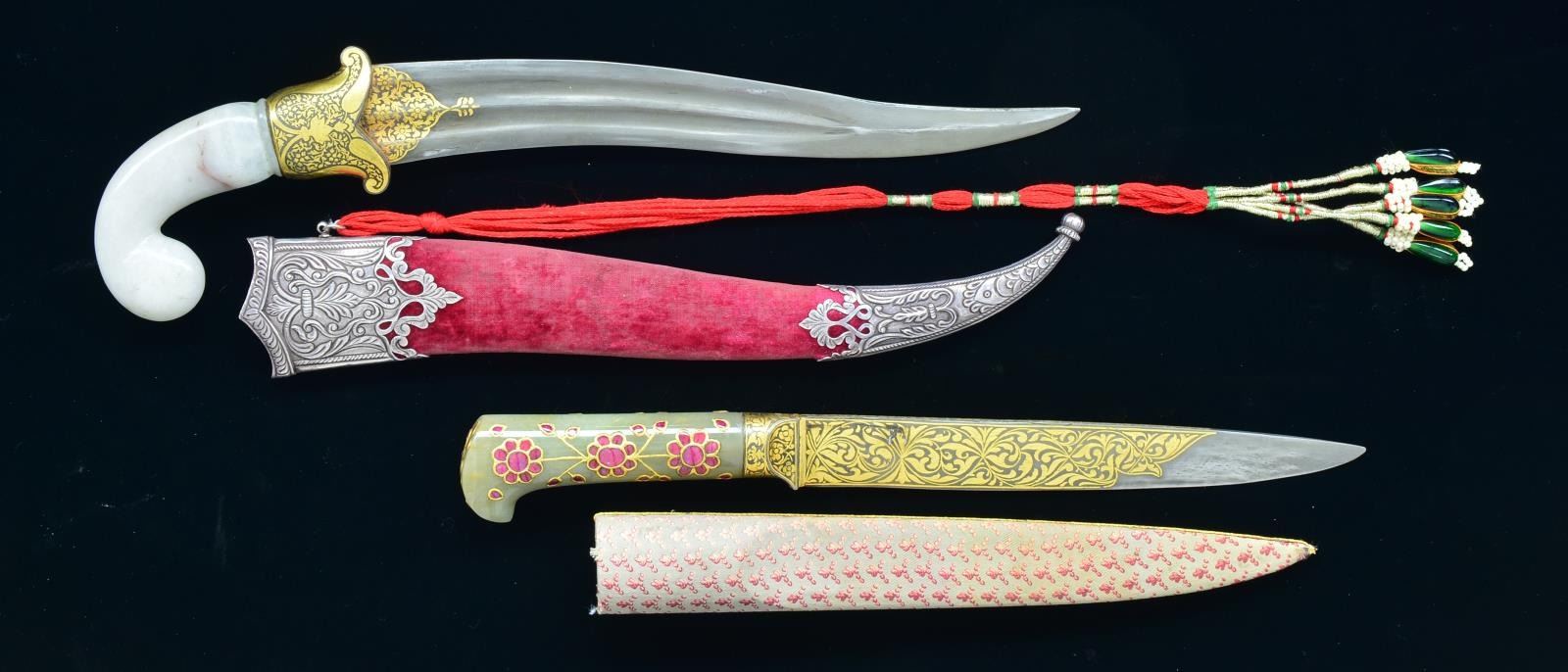 1) JADE HANDLED KARD. Overall length: 13". Blade length: 8 1/4". Blade has gold foliate inlays w/ two 3 1/2" panels on 1 side w/ lengthy Arabic inscriptions in gold. As expected, there is no guard but the ferrule is inlaid w/ gold similar to the style on the blade. The handle is carved green jade w/ inlaid gold or gold colored metal surrounding red semi-precious stones forming flowers & leaves. Scabbard is covered in a patterned putty colored silk w/ a gold bullion stripe down the top. CONDITION: knife shows very light wear overall.