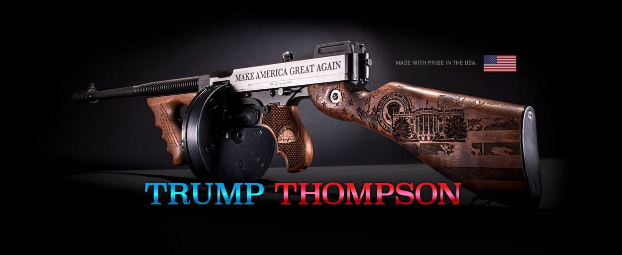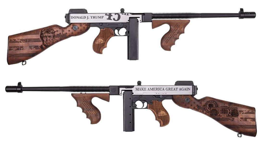 The “Trump Thompson” starts as a Model 1927 Tommy Gun, chambered in .45 ACP. It is entirely manufactured in the USA from quality steel and American walnut. On the right side is engraved an American flag, and the image of our 45th President. His name and 45th are engraved on the receiver. The grip contains his famous quote drawing the line at infringing on Americans’ rights. On the right stock are engraved the Presidential Seal, American Flag, and the White House. The grip contains another important quote from President Trump defining the Second Amendment as America’s “first freedom”. The receiver contains President Trump’s promise to “Make America Great Again”. The finish is highly durable Cerakote in Armor Black, and Cerakote Clear over high polished flats.