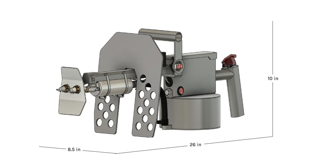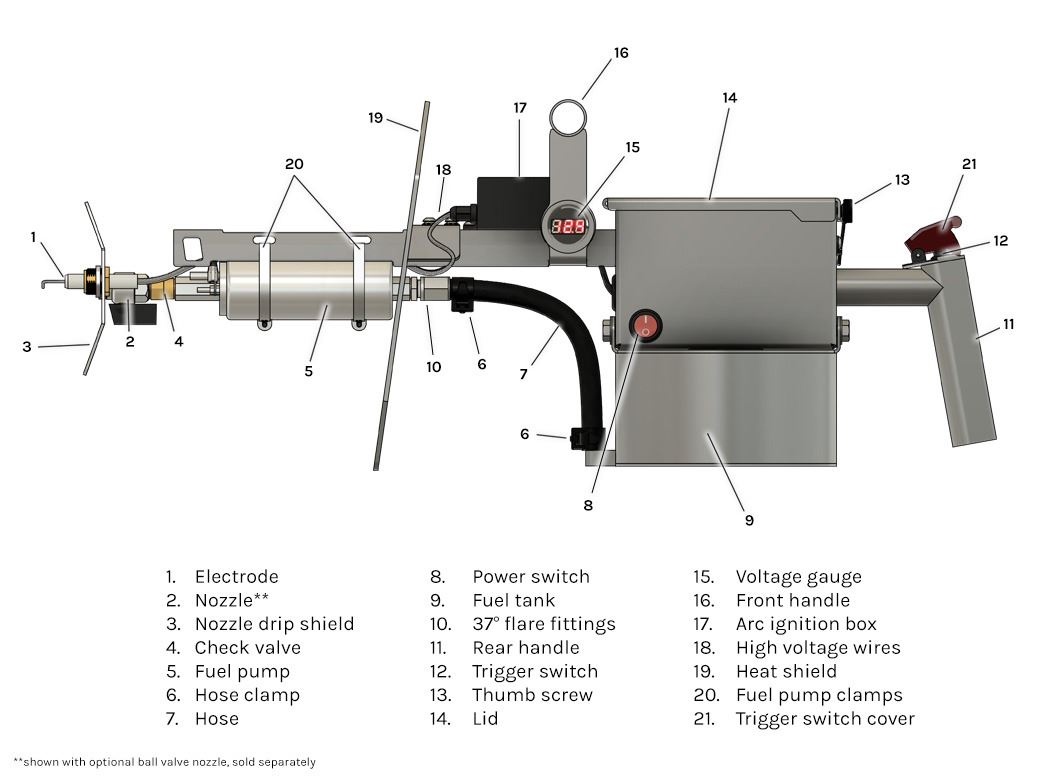 There’s no pressurized fuel canisters or pilot torches to worry about – when you press the trigger, the fuel pump draws gasoline from the reservoir and sends it through the nozzle, where it passes through an arc of plasma, kickstarting the flames.