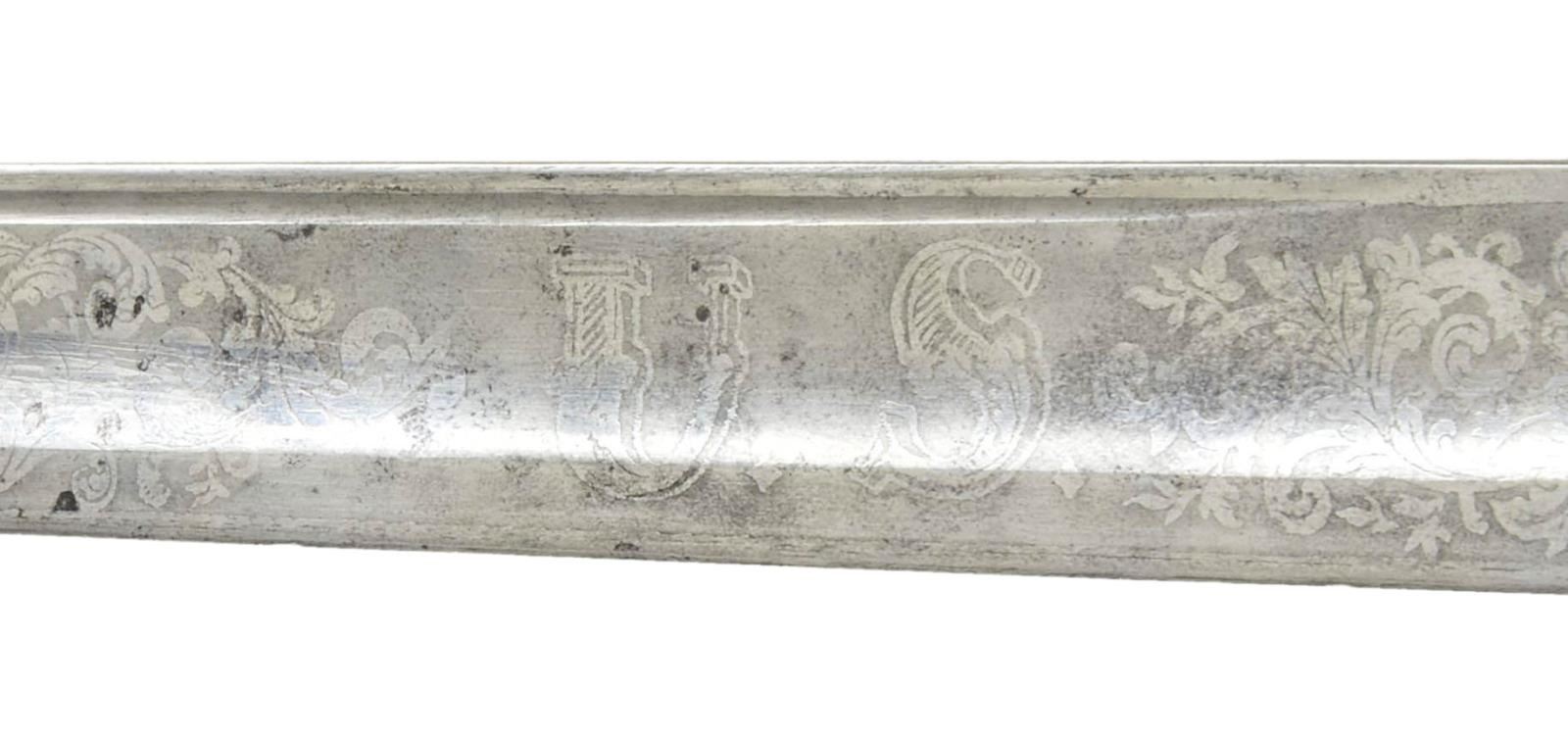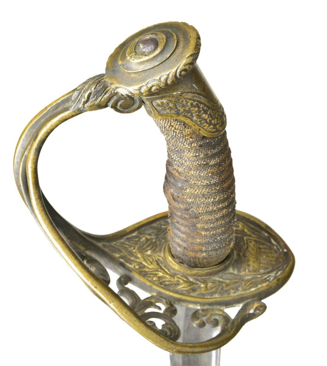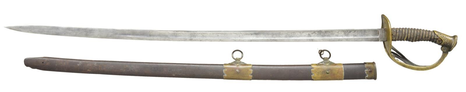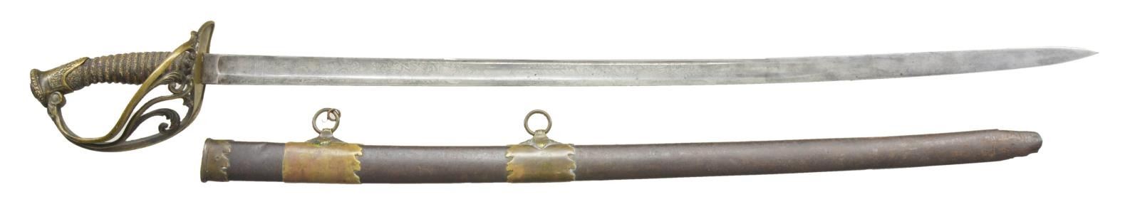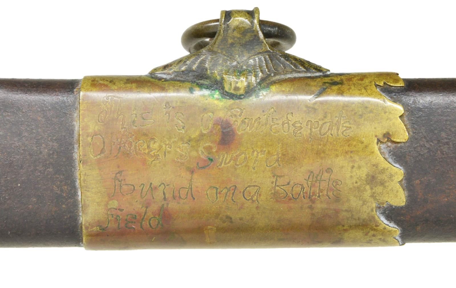 WITH CONFEDERATE ASSOCIATION. Overall length: 38". Blade length: 31 3/4". Blade has a single wide fuller below a 12" narrow fuller. Etching extends 17 1/2" up from the hilt & includes military, patriotic & foliate motifs. The spine is etched, "IRON PROOF". Gilded brass hilt featuring a highly embellished 3 branch guard joining the knuckle bow & entering a highly decorated pommel. Wire wrapped sharkskin grip. Brass mounted iron scabbard w/ the mount below the throat naively engraved, "This is a Confederate Officer's Sword found on a Battle Field". CONDITION: blade has a light gray patina w/ scattered light spotting. Etching remains crisp. Hilt is solid but shows only traces of original gilding. Sharkskin grip is about 80% intact & no wire remains. Scabbard mounts have a deep brass patina. Scabbard body has oxidation throughout. Drag is missing. (02-17527/BF). $800-1,200.