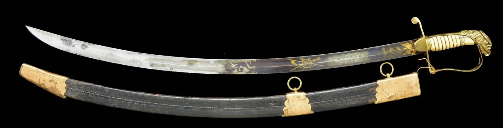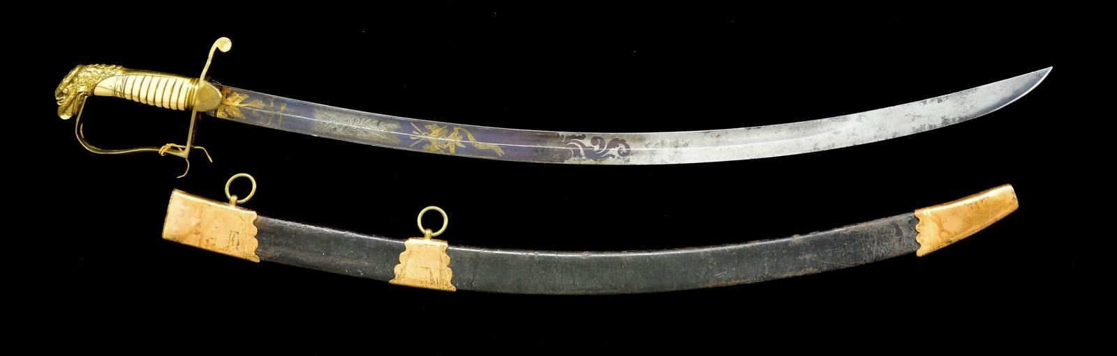 Overall length: 36". Blade length: 30". Single wide fullered blade decorated over half its length w/ bluing & gold highlighted, as well as white, etching. Etching includes a spray of arms, Federal shield, an eagle w/ ribbon in its beak that reads, "E PLURIBUS UNUM". Gilded brass hilt featuring a guard w/ spade languets & an unadorned knuckle bow terminating in a very well articulated eagle head pommel. Certifiably antique ivory grip w/ cut ribs. Gilded brass mounted leather scabbard. CONDITION: blade has a light gray patina w/ traces of original factory polish & some areas of scattered oxidation. Blue & gilt decoration is about 80% intact. Hilt shows areas of original gilding. Grip has 2 lg. age cracks but no noticeable losses. Scabbard mounts have much of the original gilding intact. Leather remains strong but is lightly flexed. (02-17536/BF). $800-1,200.