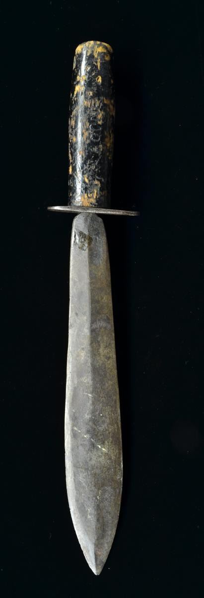 16" Overall. Well made tapering out medial ridge dbl. edged blade, 3" oval iron cross guard. Painted wood grip w/ spurious carved “CAPT.M.BOONE” & “CSA”. CONDITION: good to very good overall. Blade is unclean w/ gray/brown patina, old sharpening.(02-16664/JS). $400-500.