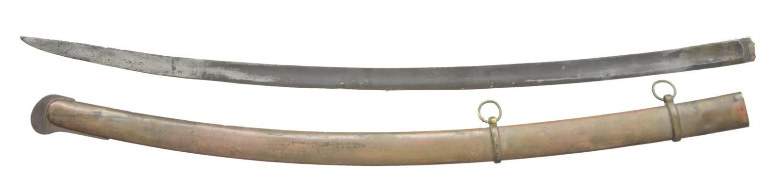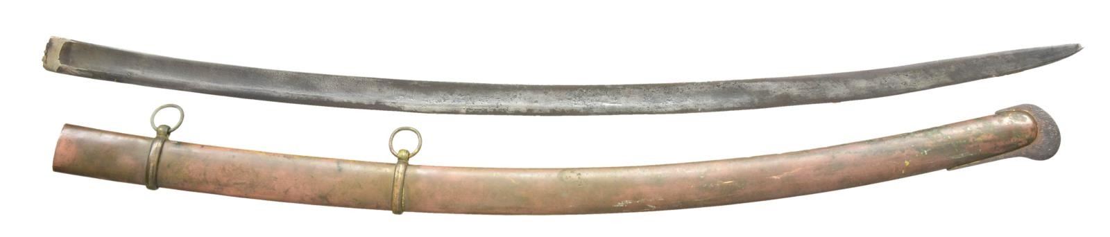 2) SCABBARD. Overall length of scabbard: 33 5/8". This is a very interesting & unquestionably original scabbard being somewhat reminiscent of a Griswold scabbard. This example has a heavy iron drag whereas Griswold scabbards have brass drags w/ a scrolled decoration at the top. The remaining entire body of the scabbard is brass. This scabbard is likely for an early European or European import saber. CONDITION: scabbard remains quite solid w/a few minor dents. (02-17539/BF). $400-700.
