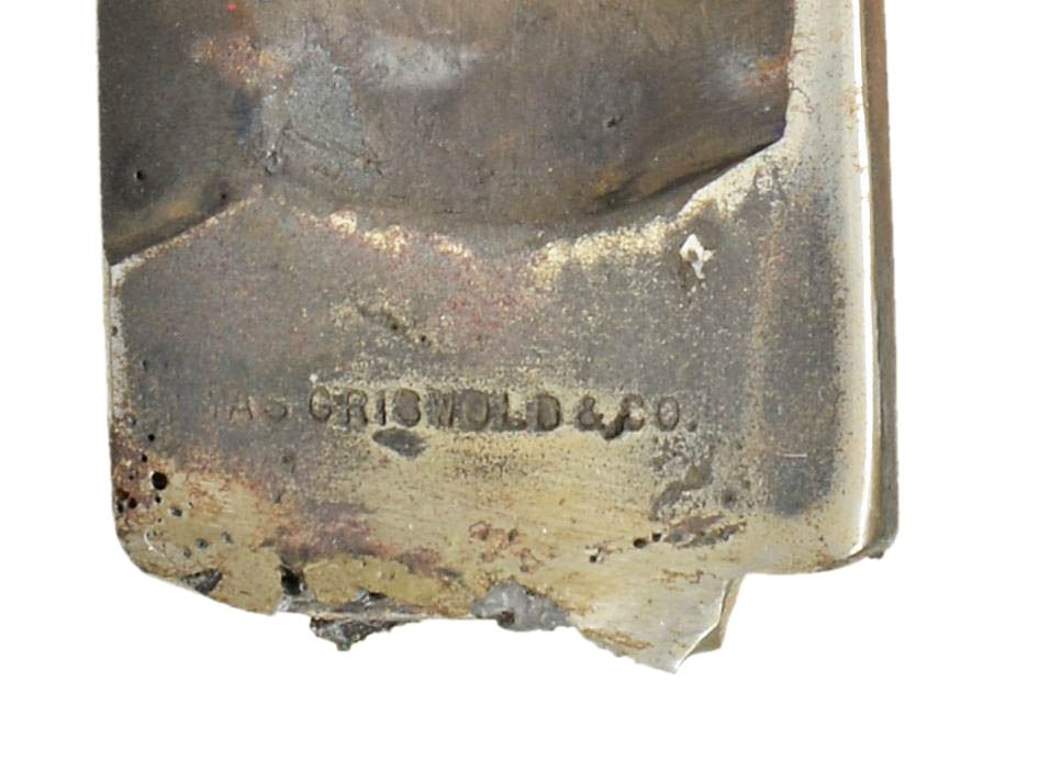 1) BLADE. Overall length of blade: 35 1/2". This is a Confederate style sword blade made by Thomas Griswold of New Orleans. The blade is marked, "( )AS GRISWOLD & CO." & is the rarely seen straight line mark. There is significant evidence of welding near the ricasso w/ visible bubbles in the steel. There is no tang or remnants of the hilt. Although the blade as a whole appears to be of Confederate mfg., we do not guarantee this to be an unaltered blade despite the angle of the grind on the base of the fuller & base of the edge. CONDITION: blade has a dark gray, cleaned mottled patina w/ evidence of grinding & possible sharpening. The area around the ricasso appears to be welded & possibly reshaped.