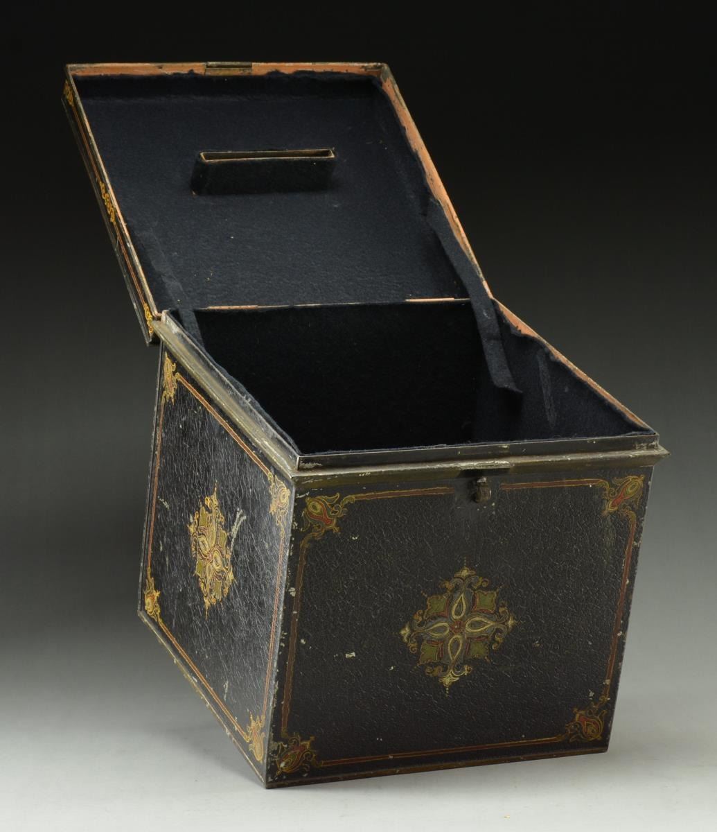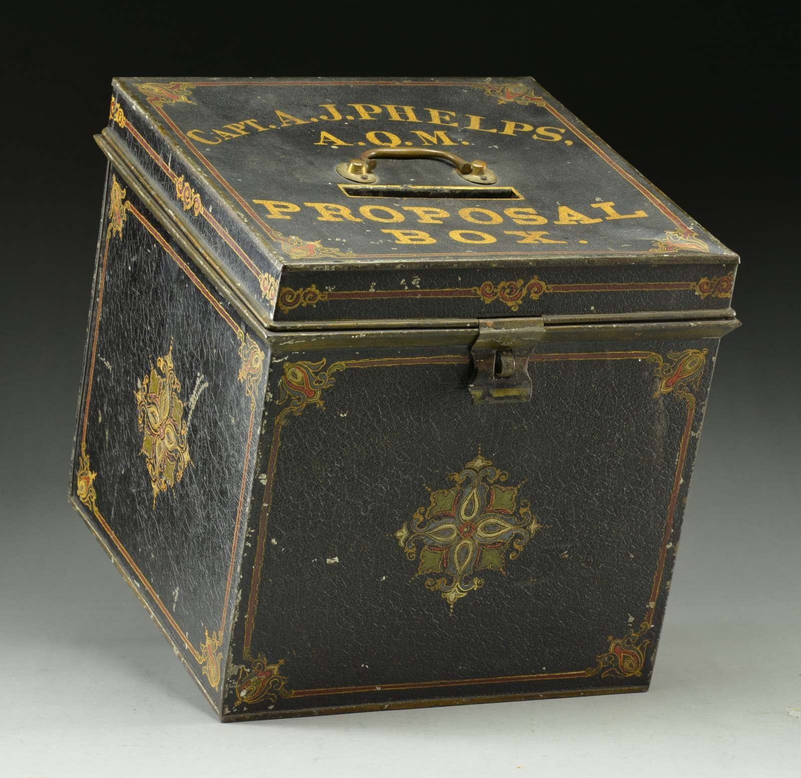 OHIO INFANTRY. Abner J. Phelps (1818-1885) joined 12th Ohio Battery as a 42 year old private June 17, 1861, later service as private to sergeant, in 25th Ohio Infantry till accepting appointment as Captain & Assistant Quartermaster, US Volunteers, March 20, 1863. He served in Cincinnati and at Ft. Leavenworth in this capacity and rank till war’s end in 1865. I am not sure what a “proposal box was used for, but it is beautiful and elegant like Phelps fine penmanship seen in the numerous letters he wrote to Washington found in his National Archive service file. About 12” x 12” x 12” with locking lid, slot in top for papers to be dropped. Gold painted lettering and Victorian multicolor decorated designs. In one letter he states he is handling hundreds of thousands of dollars, so maybe box is for contractors submitting bids for supplies needed by the army. CONDITION: very good overall, paint is well preserved with craquelure and few reductions. Felt lined of unknown age is also very good. (02-17024/JS). $800-1,200.
