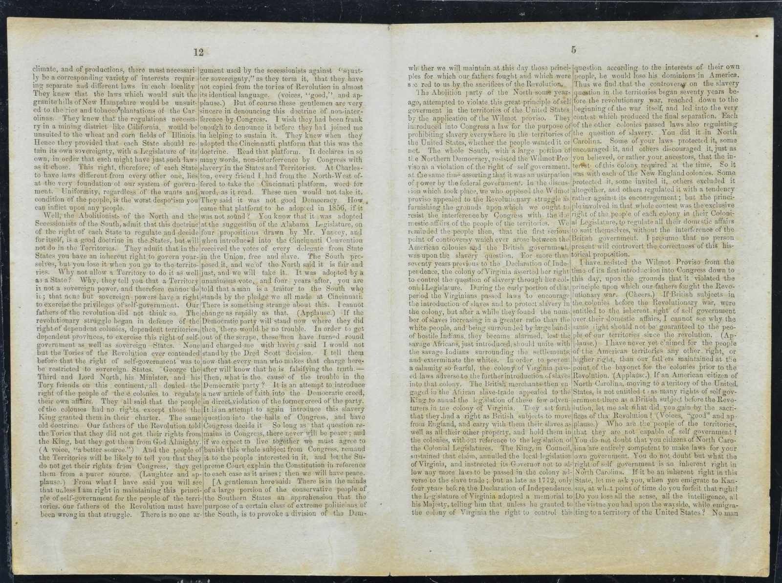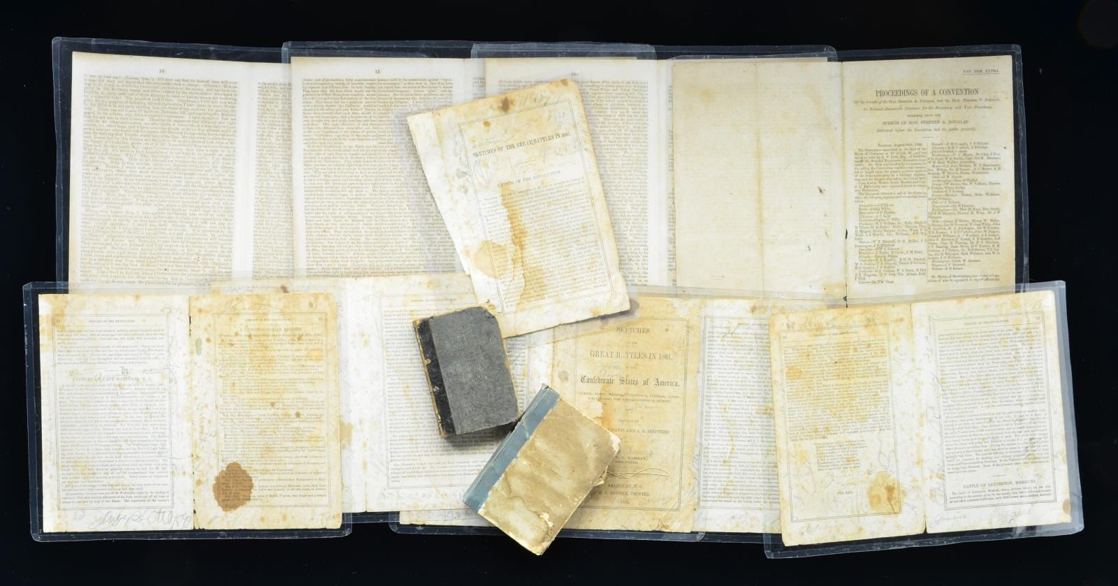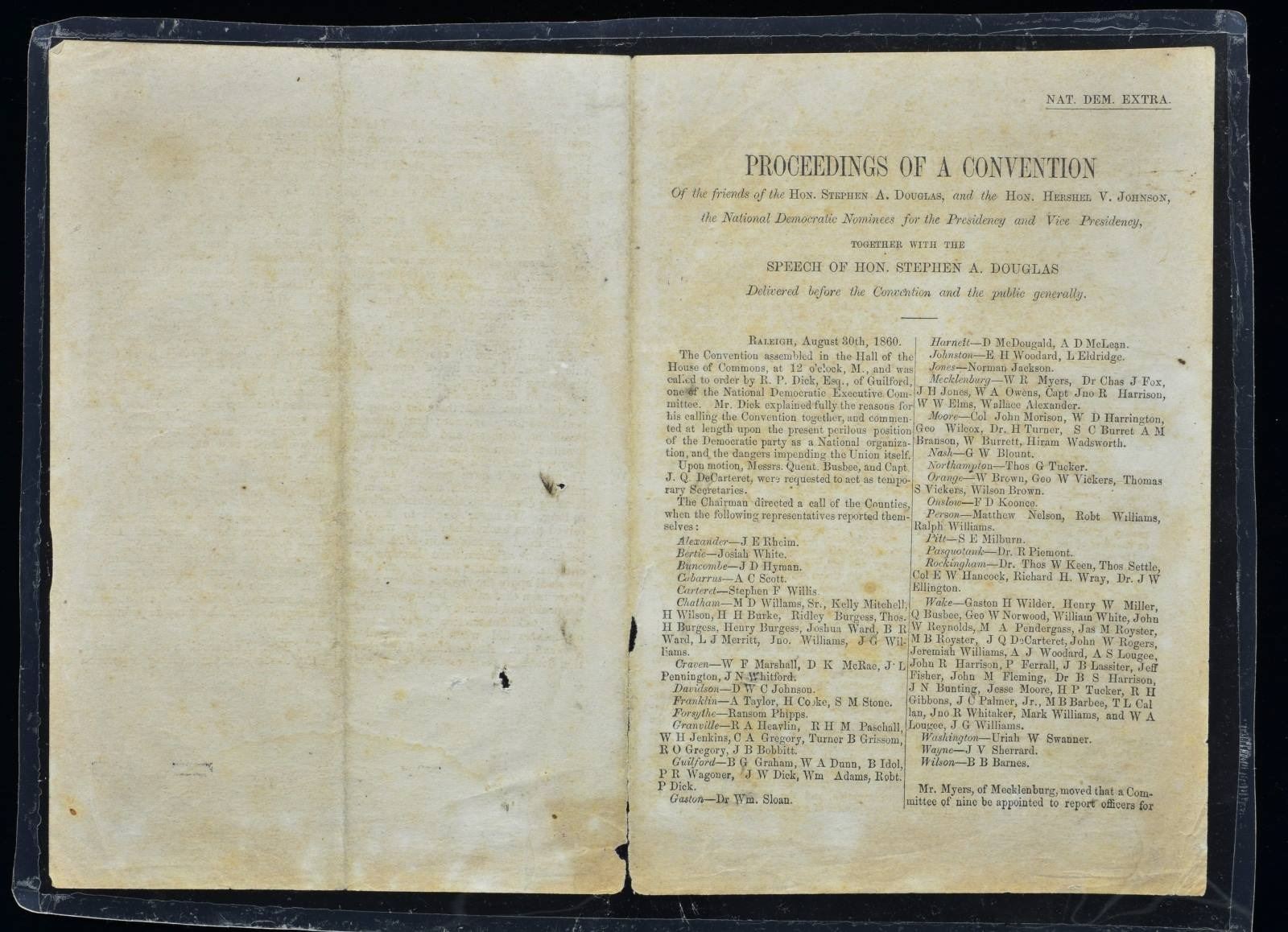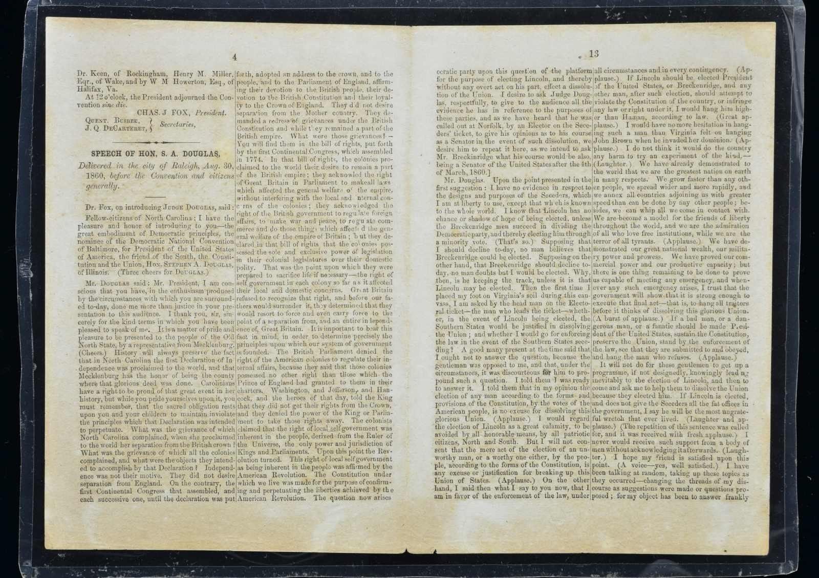 2) 15 page disbound 1860 pamphlet from Democratic National Convention at Raleigh, NC including transcription of Stephen Douglas speech lambasting Lincoln and applauding slavery’s right and need to be maintained. Condition: good, complete, each double page archivally encapsulated in acid free mylar.