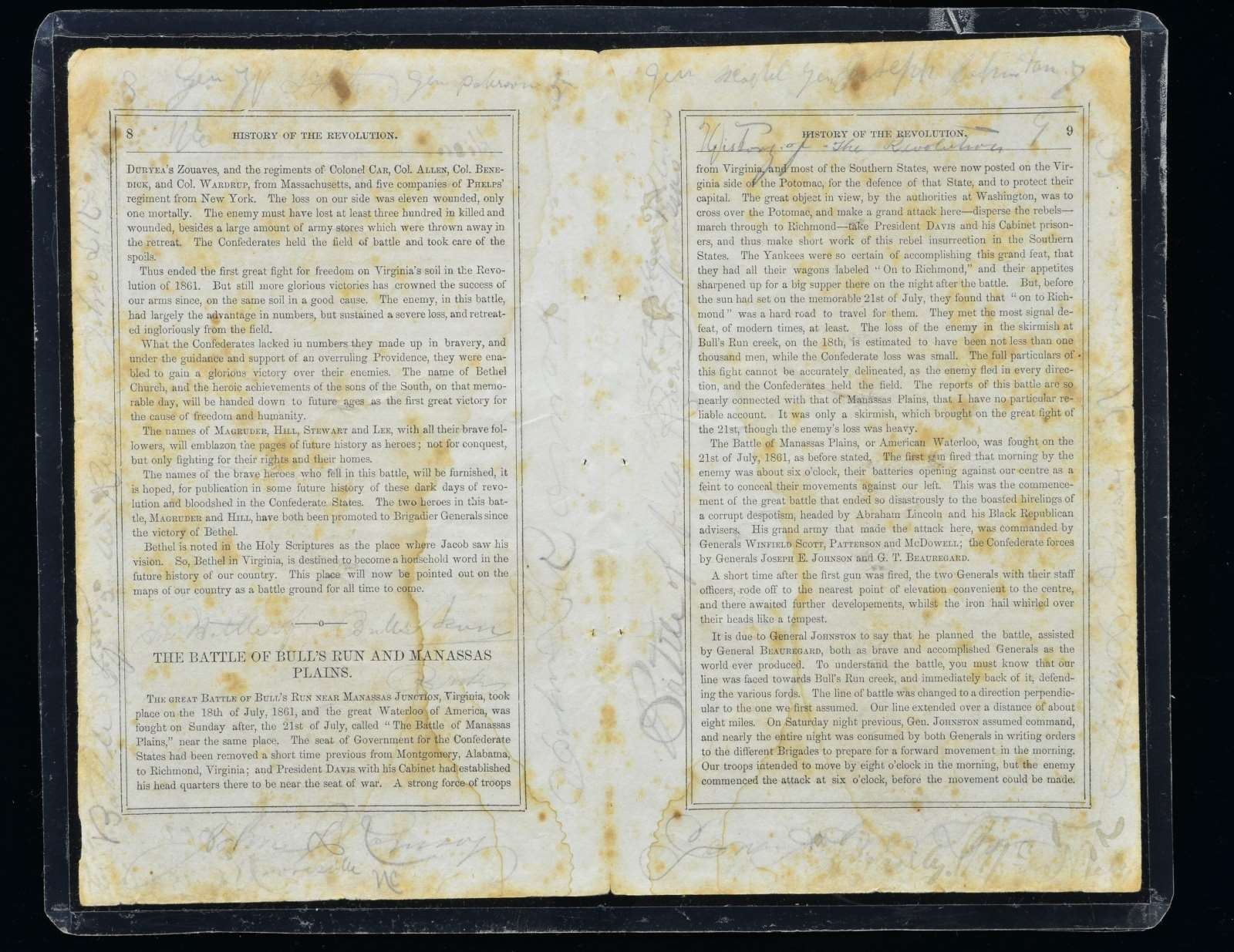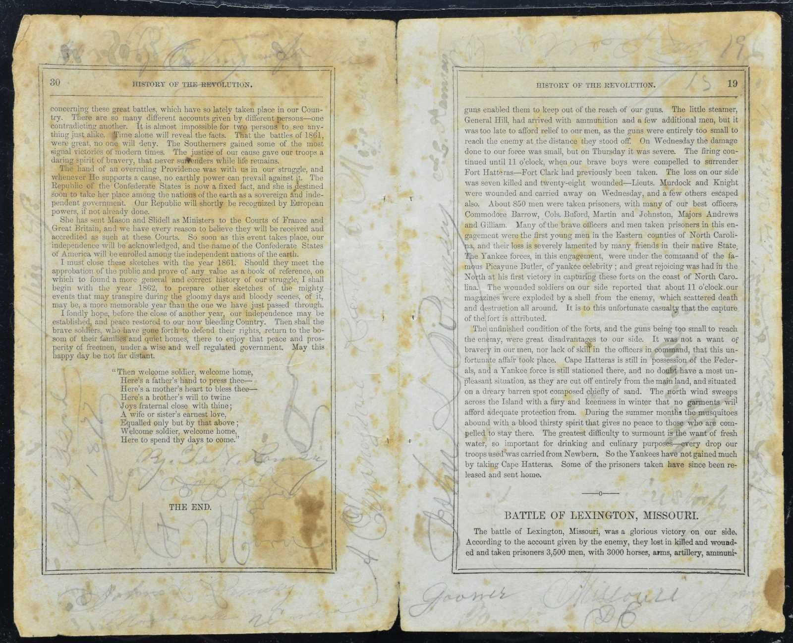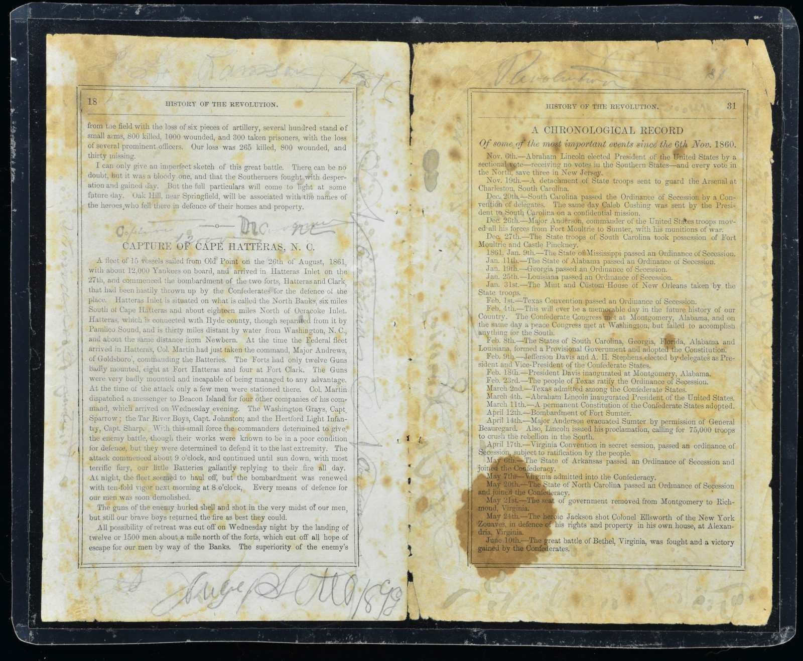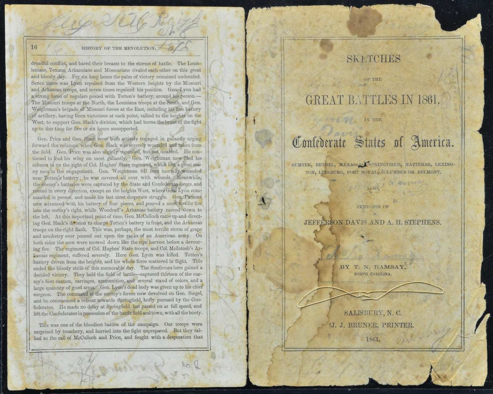 3) 22 disbound pages of CS NC imprint: Sketches of the Great Battles in 1861 in The Confederate States of America, Salisbury, NC, JJ Bruner-Printer, by T. N. Ramsay.