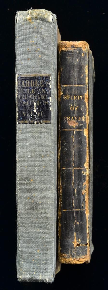 1) HARDEE’S TACTICS, Vol. 2, rare Confederate 1861 Mobile, Alabama imprint, 232 pages, foldout plates, signed in ink with unit and name on end paper “Lt. Col. Geo. W. (last name hard to decipher). CONDTITION: fair, complete other than one partially torn out plate, scuffed binding, gilt lettered pasted title label on spine-scuffed but complete, water stained cover, foxing and acid burn.